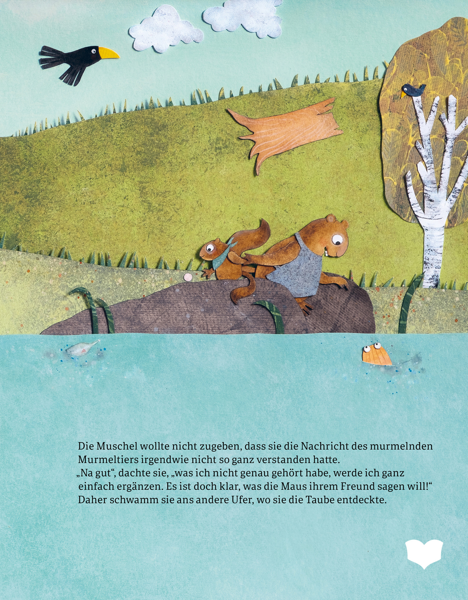 Rebekka Stelbrink hat zur Geschichte von Andrea Tuschka mit Pinsel, Schere und Papier farbenfrohe, filigrane Collagen der Waldbewohner erschaffen, die in dreidimensionale Welten eintauchen lassen.