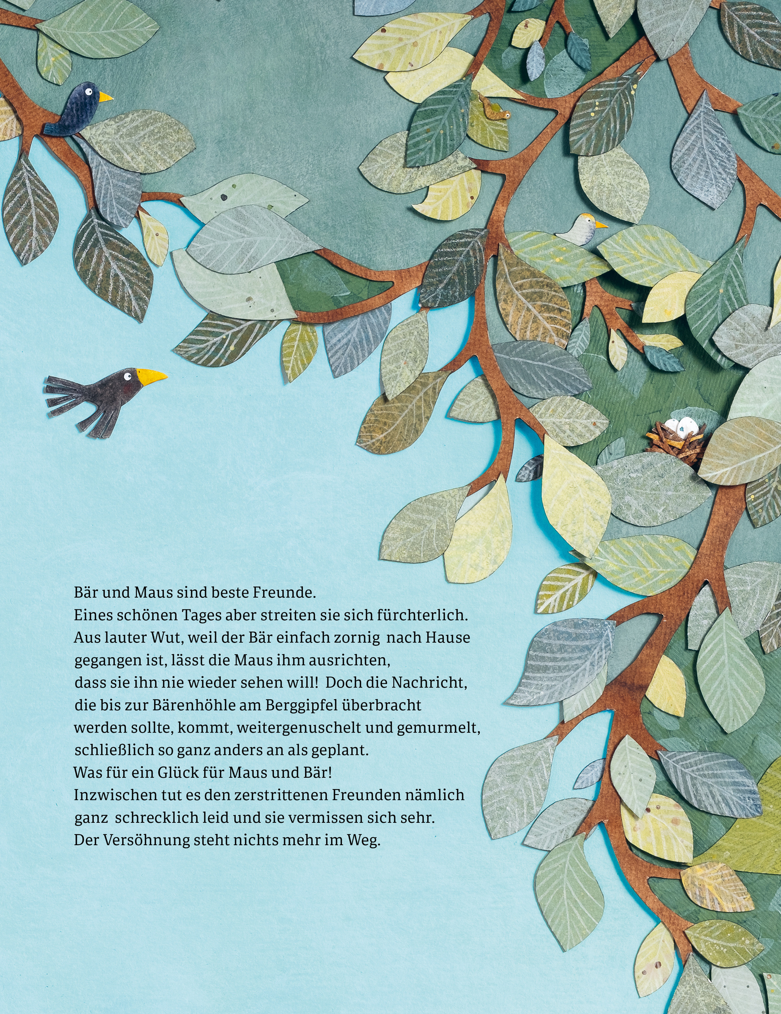 Bär und Maus sind beste Freunde. Eines schönen Tages aber streiten sie sich fürchterlich. Aus lauter Wut, weil der Bär einfach zornig nach Hause gegangen ist, lässt die Maus ihm ausrichten, dass sie ihn nie wieder sehen will! Doch die Nachricht, die bis zur Bärenhöhle am Berggipfel überbracht werden sollte, kommt, weitergenuschelt und -gemurmelt, schließlich so ganz anders an als geplant. Was für ein Glück für Maus und Bär! Inzwischen tut es den zerstrittenen Freunden nämlich ganz schrecklich leid und sie vermissen sich sehr. Der Versöhnung steht nichts mehr im Weg.