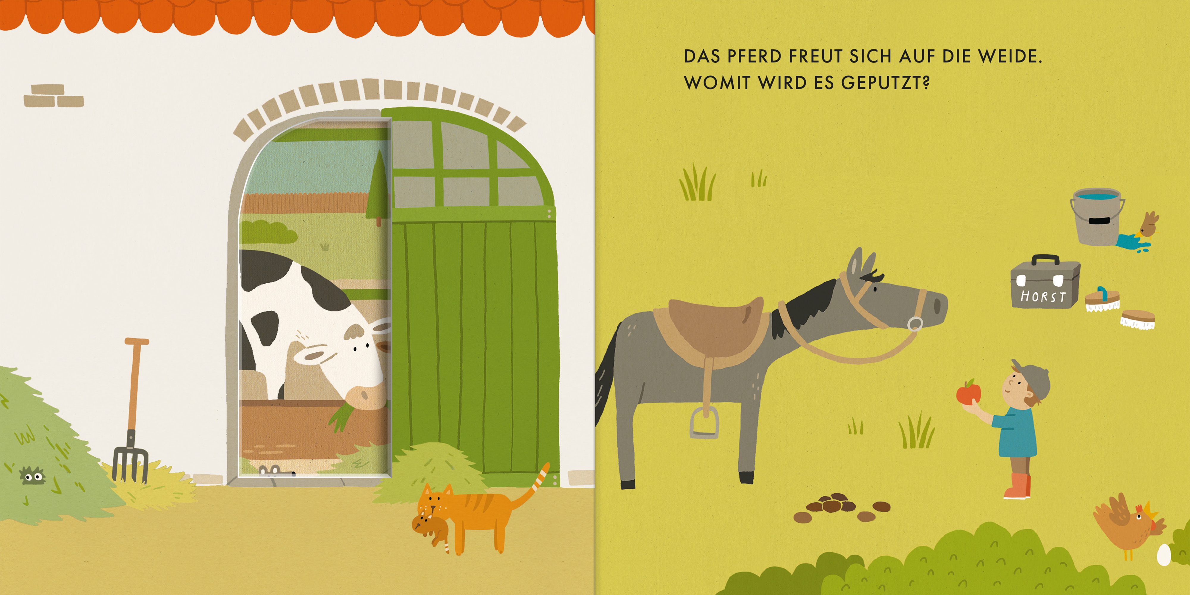Was die Kuh wohl gerade im Stall macht? Ah, sie wird von der Bäuerin gemolken. Die verschiedenen Stanzformen in dieser Aktivitätspappe führen die kleinen Leser:innen von draußen in den Kuhstall, den Hühnerstall und auf die Pferdekoppel und erweitern ihre räumliche Wahrnehmung. Mit einer klaren und freundlichen Bildsprache haben Kinder ab 18 Monaten Freude am Entdecken von bekannten Formen, Farben und Tieren.