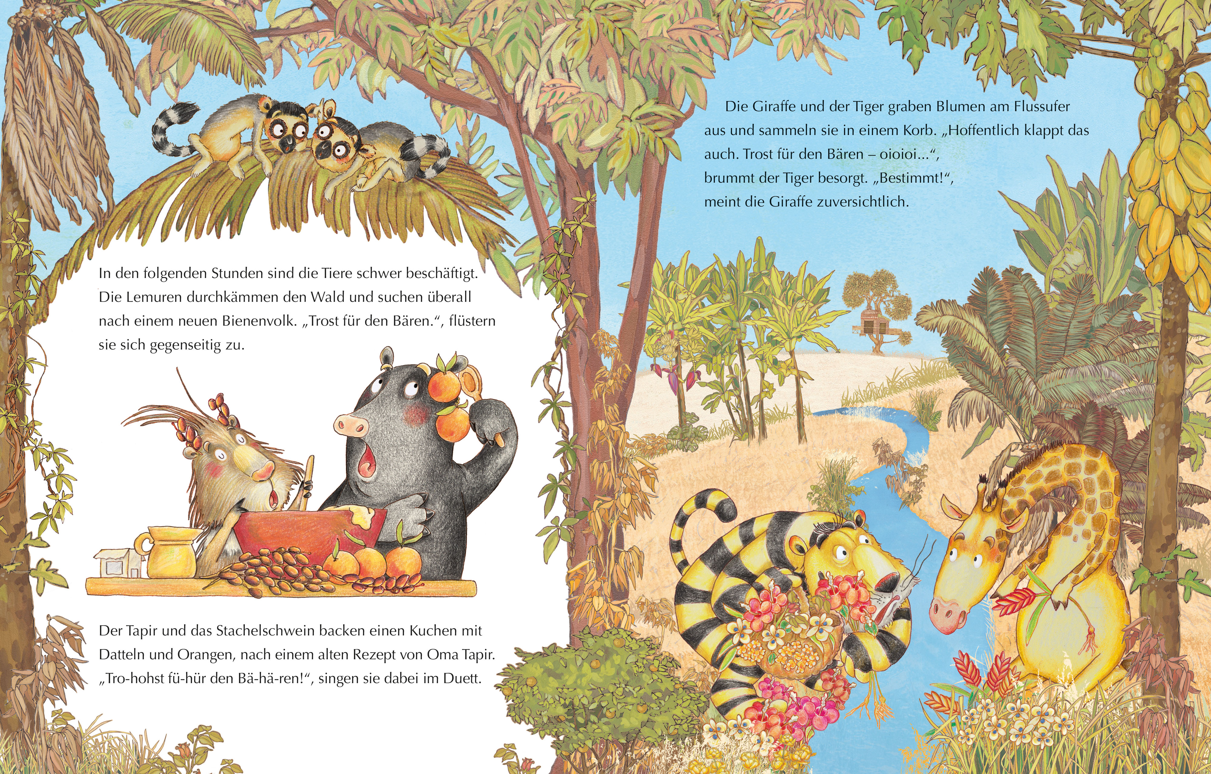 Der Bär liegt brummend in seinem Bett. Was ist bloß los mit ihm? Ohrensausen, Schüttelfrost, auch die tödliche Langeweile hat er nicht. Dann kommt der Tiger drauf: Der Bär hat Kummer, ganz ganz großen Kummer. Gut, dass er die anderen Tiere hat, die Kuchen backen, Blumen pflücken und ihm Bienengesumm nachhause bringen. Zusammen mit seinen Freunden geht es dem Bär schon bald wieder gut!