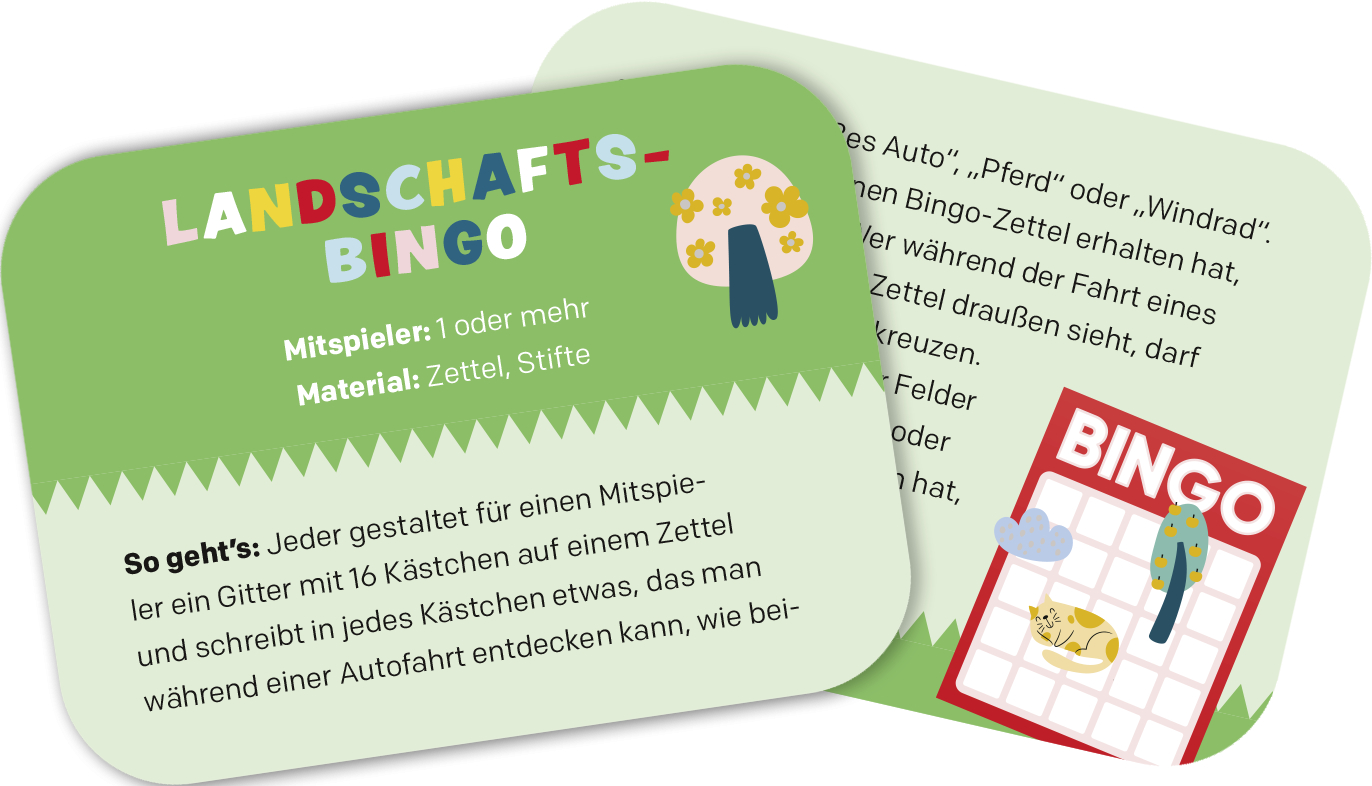 Die Fahrt in den Urlaub, zu Verwandten oder auch einfach zum Einkaufen - die Zeit im Auto kann ganz schön lang und vor allem ziemlich langweilig sein. Damit auch der Weg zum Ziel zum Vergnügen wird, gibt es 25 Ideen für Spiele für die Autofahrt in der praktischen Metalldose. Ob eine ABC-Geschichte erfinden, Landschafts-Bingo spielen oder lustige Lieder pfeifen, in der Ideensammlung findet jedes Kind die passende Unterhaltung. Die Spiele sind mit keinem oder wenig Material und meist ab einem Spieler spielbar, sodass die Kinder sofort loslegen können.
