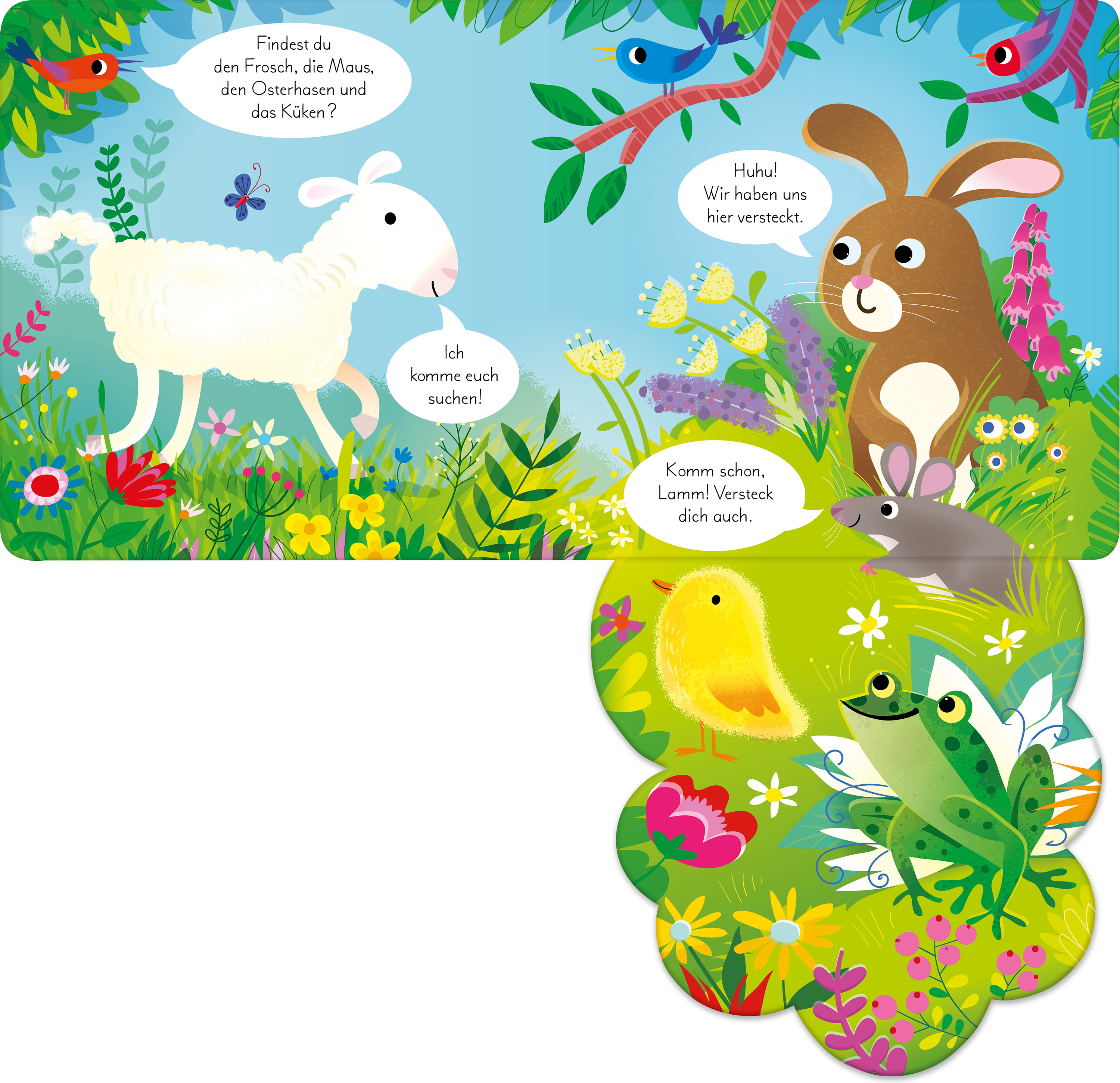 Hilf dem Osterhasen, alle seine Freunde zu finden! Entdeckst du Küken, Maus, Frosch und Lamm hinter den dichten Blättern und unter den extragroßen Klappen? Ein aufregendes Such-Abenteuer für die Kleinsten.