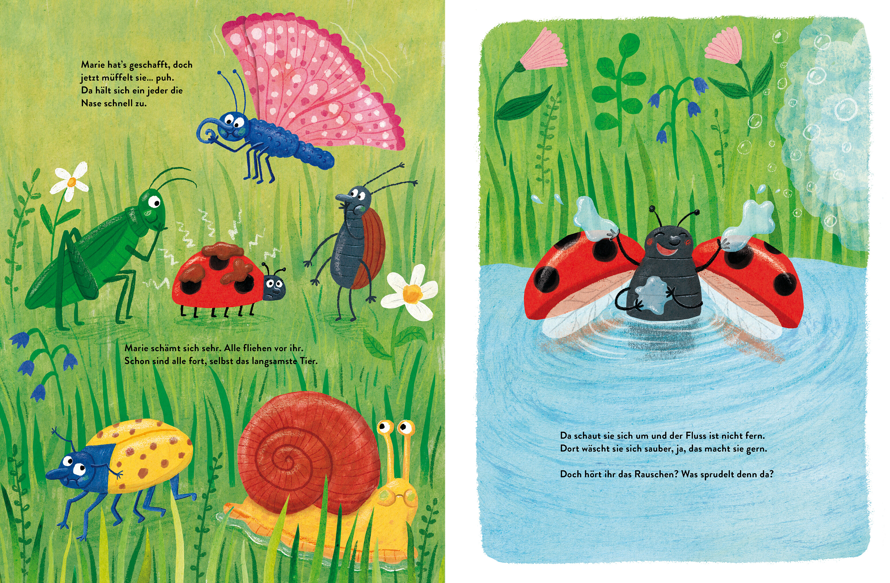 Als Marie Käfer unten auf der Wiese das allerschönste, vierblättrige Kleeblatt entdeckt, muss sie es unbedingt haben. So schnell sie kann, fliegt Marie darauf zu, doch ... es macht PENG! Sie prallt gegen einen schwarz-weißen Kuhpopo. Und oh je, kaum hat sie sich aufrappelt, folgt schon das nächste Unglück. Schafft sie es mit ganz viel Glück, ihr Kleeblatt zu bekommen?