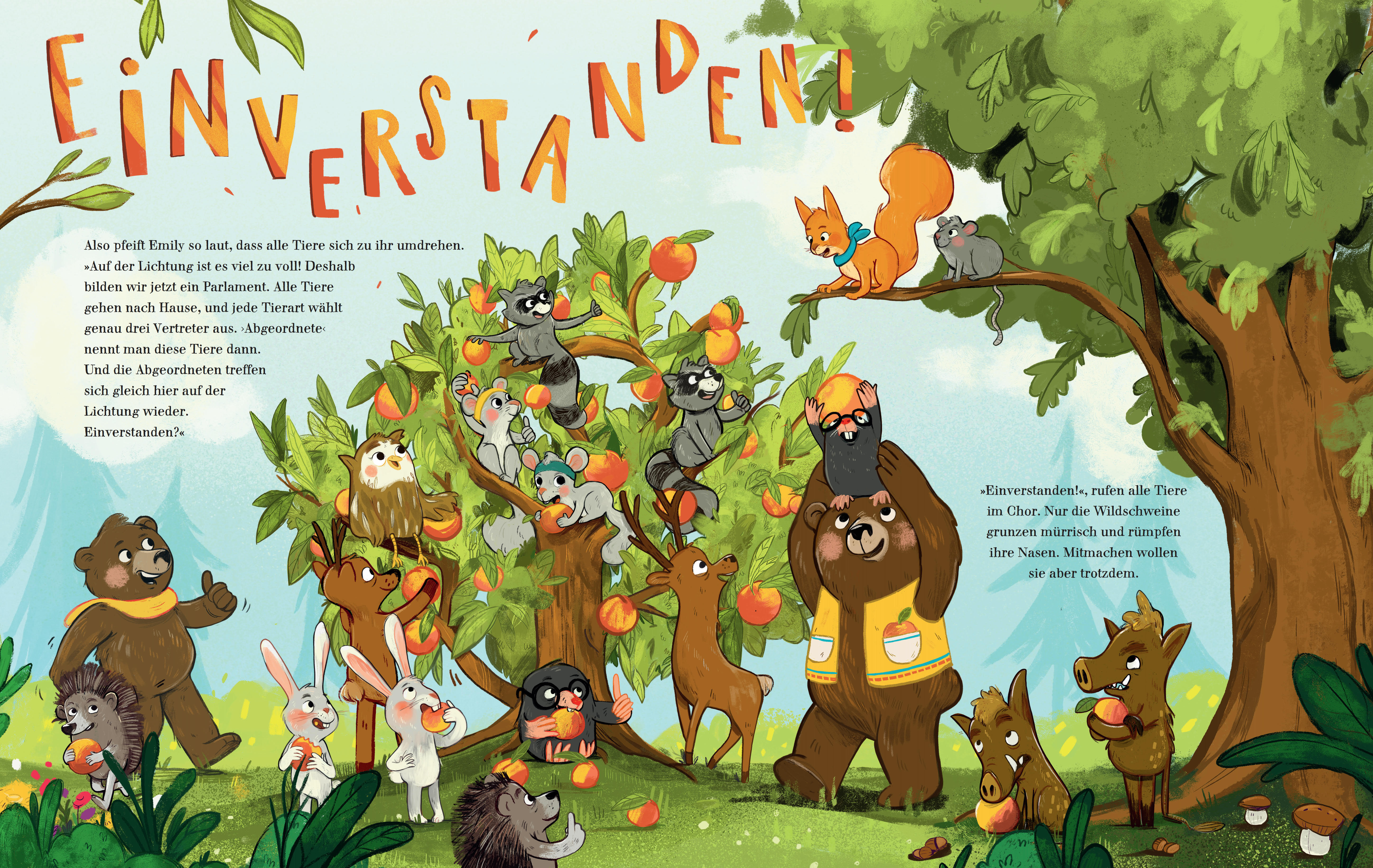 Eines Morgens entdeckt Eichhörnchen Emily auf der Waldlichtung einen Baum, der voller Pfirsiche hängt. Als bald darauf auch die anderen Tiere davon erfahren, ist das Gerangel groß. Jeder möchte einen Pfirsich haben, und zwar sofort! Emily ist besorgt, dass in dem Durcheinander etwas passiert. Also macht sie einen Vorschlag: »Lasst uns ein Parlament gründen!« Dessen Aufgabe soll es sein, die Pfirsiche fair zu verteilen. Und so wählen die Tiere des Waldes Abgeordnete, bringen Vorschläge ein und streiten für die beste Lösung. Ob am Ende ein Kompromiss gefunden werden kann, mit dem alle zufrieden sind?
