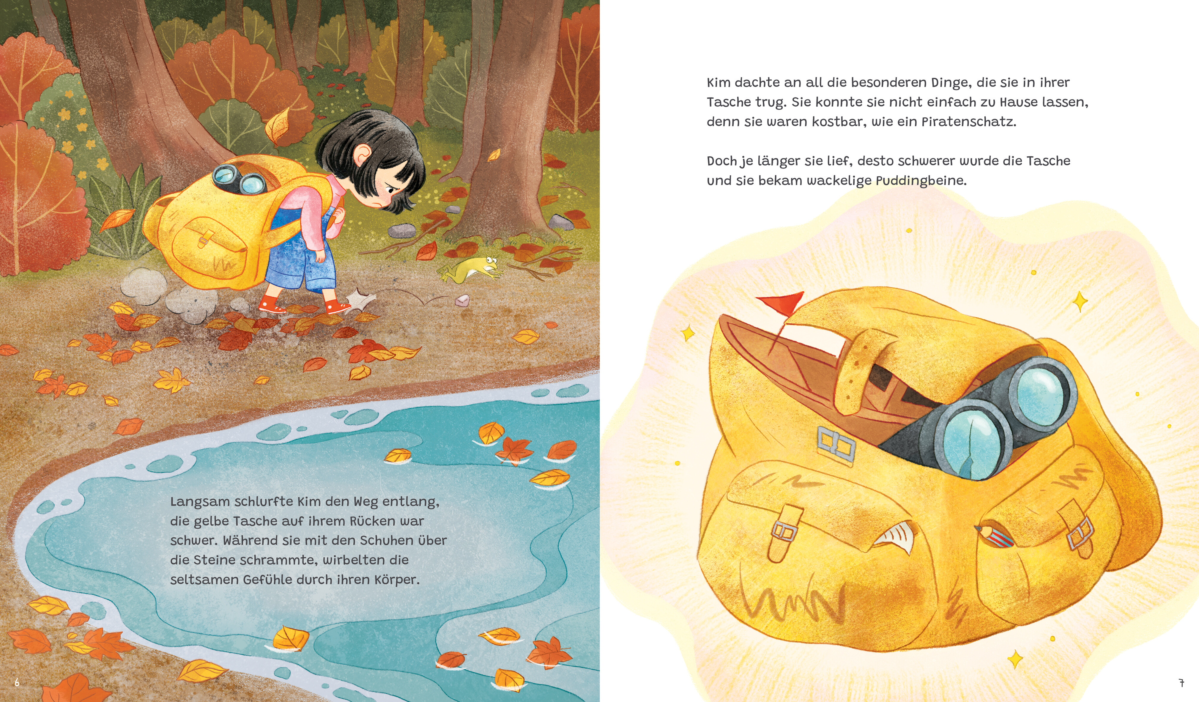 Kim liebt es, Tiere und Pflanzen zu entdecken und draußen zu spielen. Aber seit dem Tod ihres geliebten Großvaters fühlt sie sich allein und traurig. Sie trägt eine schwere Tasche voller Erinnerungen an ihn auf ihren Schultern, die sie kaum zu tragen vermag. Doch dann geschieht etwas Wunderbares: Sie begegnet drei besonderen Menschen, die ihr helfen, ihre Traurigkeit zu fühlen und darüber zu sprechen.