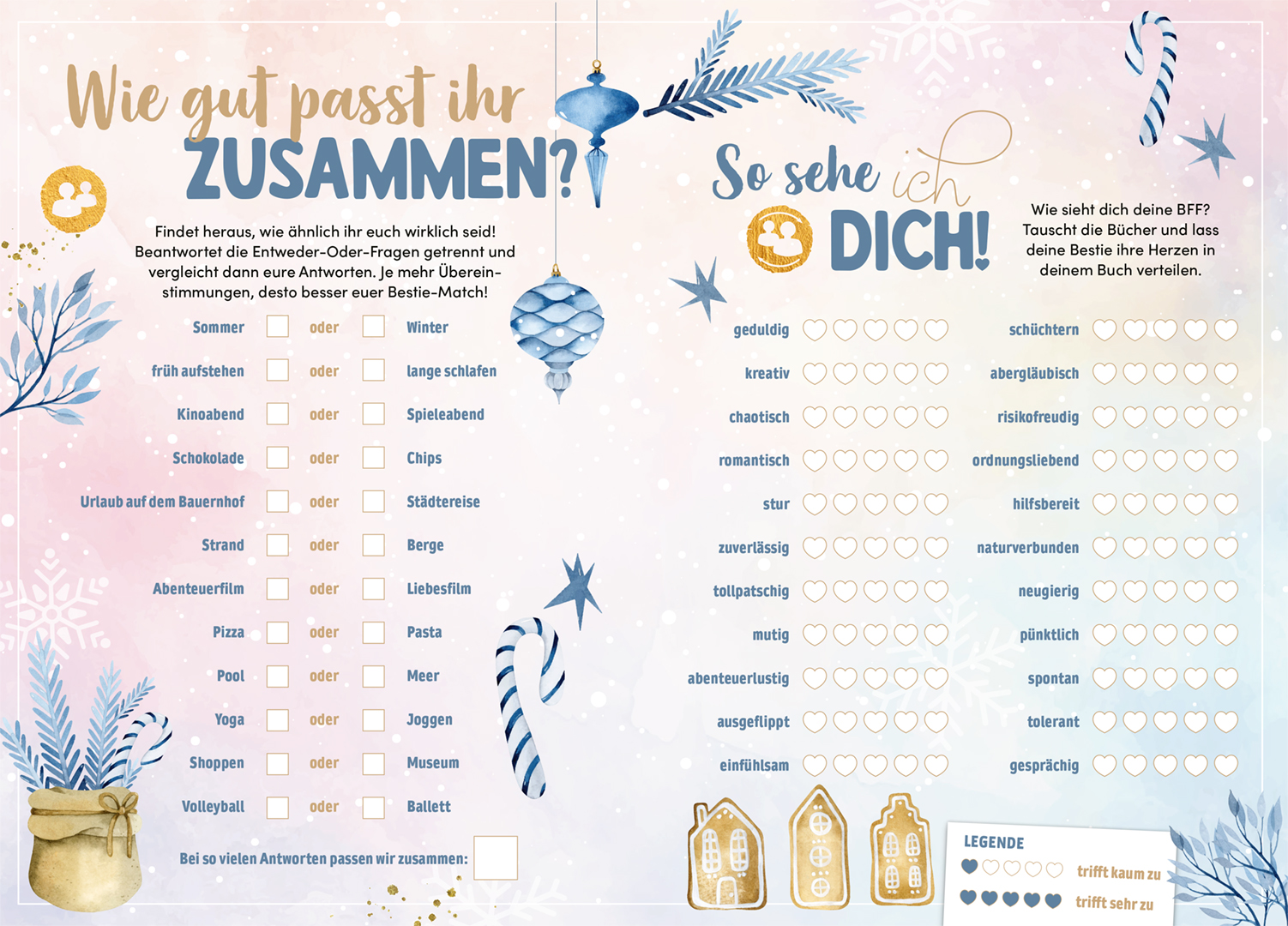 Mit diesem einzigartigen Doppelbuch-Adventskalender erlebt ihr die Vorweihnachtszeit auf besondere Weise: Ein Buch für dich und eines für deine beste Freundin! Jeden Tag könnt ihr gemeinsam eine neue Überraschung entdecken, die Bücher miteinander tauschen und ausfüllen. So wird der Advent zu einer Zeit voller Spaß und unvergesslicher Freundschaftsmomente!