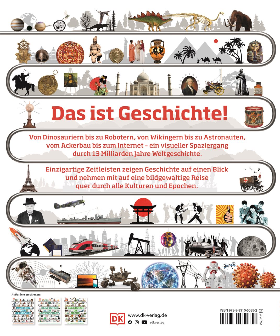 | Schlagworte | ab 10 Jahren • ab 8 Jahren • Ab 9 Jahren • Ägypten • Altertum • Antike • Big History • Buch über Geschichte • Epochen • frühe Menschen • Für die ganze Familie • Geschichte der Erde • Geschichte der Welt • Geschichte erklärt • Geschichte für Jugendliche • Geschichte für Kinder • Geschichte in Bildern • Geschichtsbuch • Geschichtsunterricht • Griechen • Kinderbuch Geschichte • Kindersachbuch • Kulturen • Kulturgeschichte • Mauerfall • Menschheitsgeschichte • Mittelalter • Moderne • Reise durch die Zeit • Renaissance • Ritter • Römer • Sachbuch • Visuelle Geschichte • Vom Urknall bis zum Internet • Vorgeschichte • Weltgeschichte • Wikinger • Wissen für Kinder • Zeitleisten • Zeitreise |