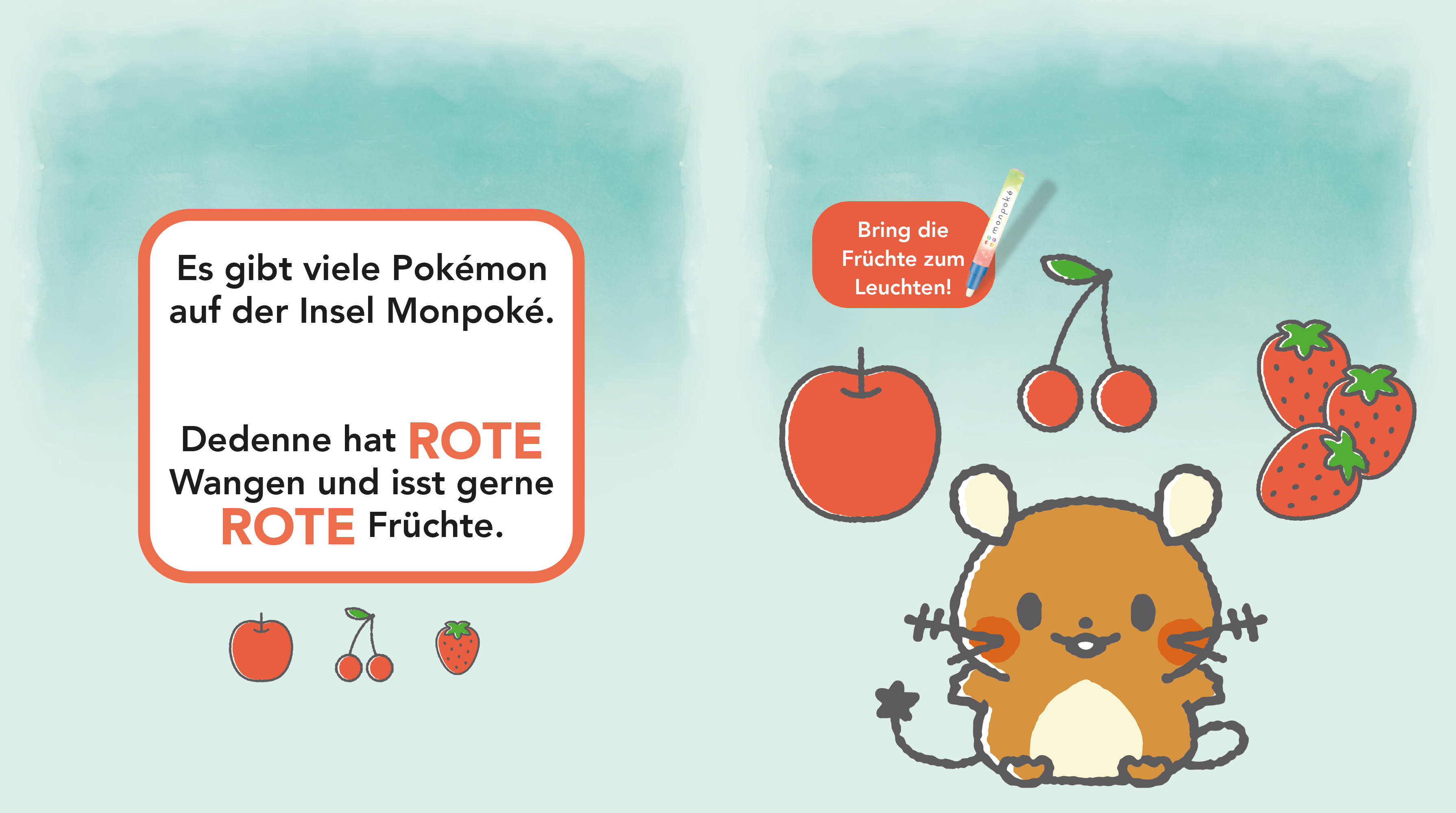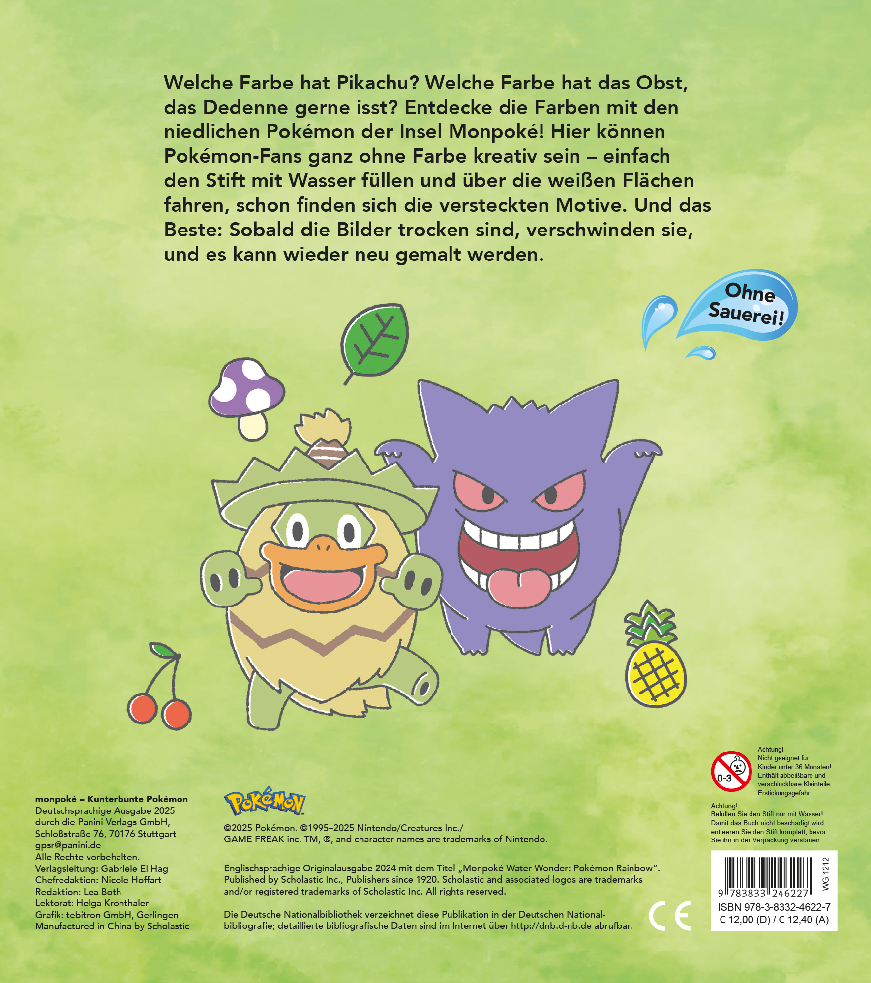 Welche Farbe hat Pikachu? Welche Farbe hat das Obst, das Dedenne gerne isst? Entdecke die Farben mit den niedlichen Pokémon der Insel Monpoké! Hier könnenPokémon-Fans ganz ohne Farbe kreativ sein - einfach den Stift mit Wasser füllen und über die weißen Flächen fahren, schon finden sich die versteckten Motive. Und das Beste: Sobald die Bilder trocken sind, verschwinden sie, und es kann wieder neu gemalt werden.