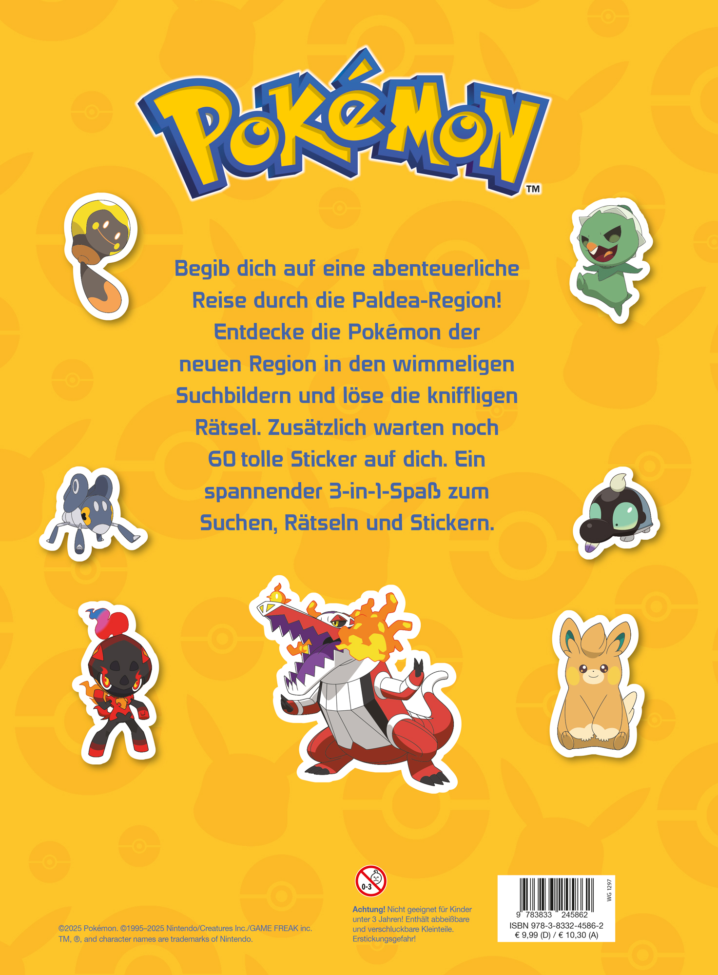 Begib dich auf eine abenteuerliche Reise durch die Paldea-Region! Entdecke die Pokémon der neuen Region in den wimmeligen Suchbildern und löse die kniffligen Rätsel. Zusätzlich warten noch 60 tolle Sticker auf dich. Ein spannender 3-in-1-Spaß zum Suchen, Rätseln und Stickern.
