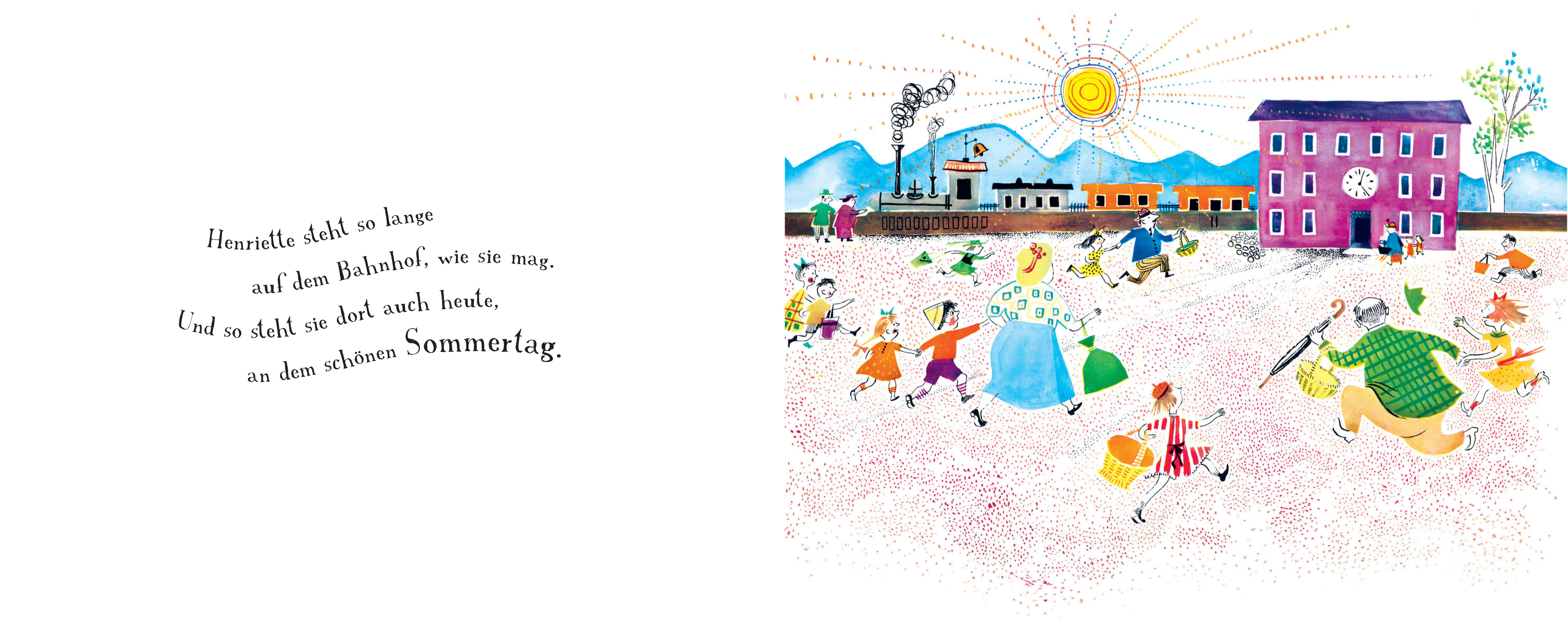 Selten hat Bahnfahren so viel Spaß gemacht wie mit Henriette Bimmelbahn. Da pfeift und bimmelt es, rattert und knattert, dampft und faucht, wenn sich die kleine freundliche Bahn mit der großen Glocke durch die Landschaft schlängelt. Da winken Kuh und Hasen, wenn Henriette fröhlich grüßend mit vielen Kindern an Bord vorbeiruckelt und -zuckelt. Und natürlich hat die gute Henriette Zeit genug für einen Halt an der bunten Blumenwiese, bevor sie klappernd und plappernd jedes Kind mit Blumenstrauß bei Oma oder Opa abliefert.