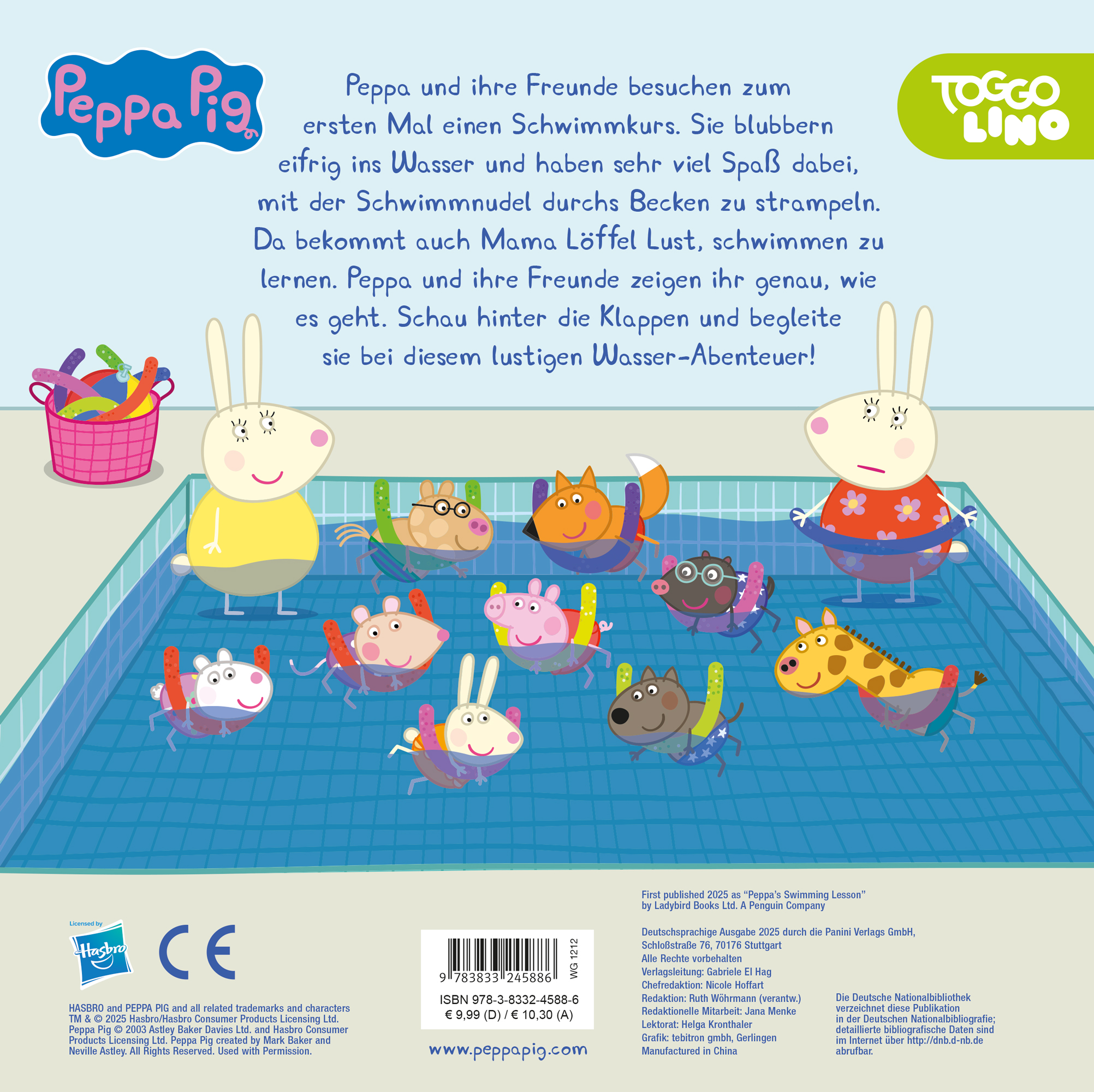 Peppa und ihre Freunde besuchen zum ersten Mal einen Schwimmkurs. Sie blubbern eifrig ins Wasser und haben sehr viel Spaß dabei, mit der Schwimmnudel durchs Becken zu strampeln. Da bekommt auch Mama Löffel Lust, schwimmen zu lernen. Peppa und ihre Freunde zeigen ihr genau, wie es geht. Schau hinter die Klappen und begleite sie bei diesem lustigen Wasser-Abenteuer!