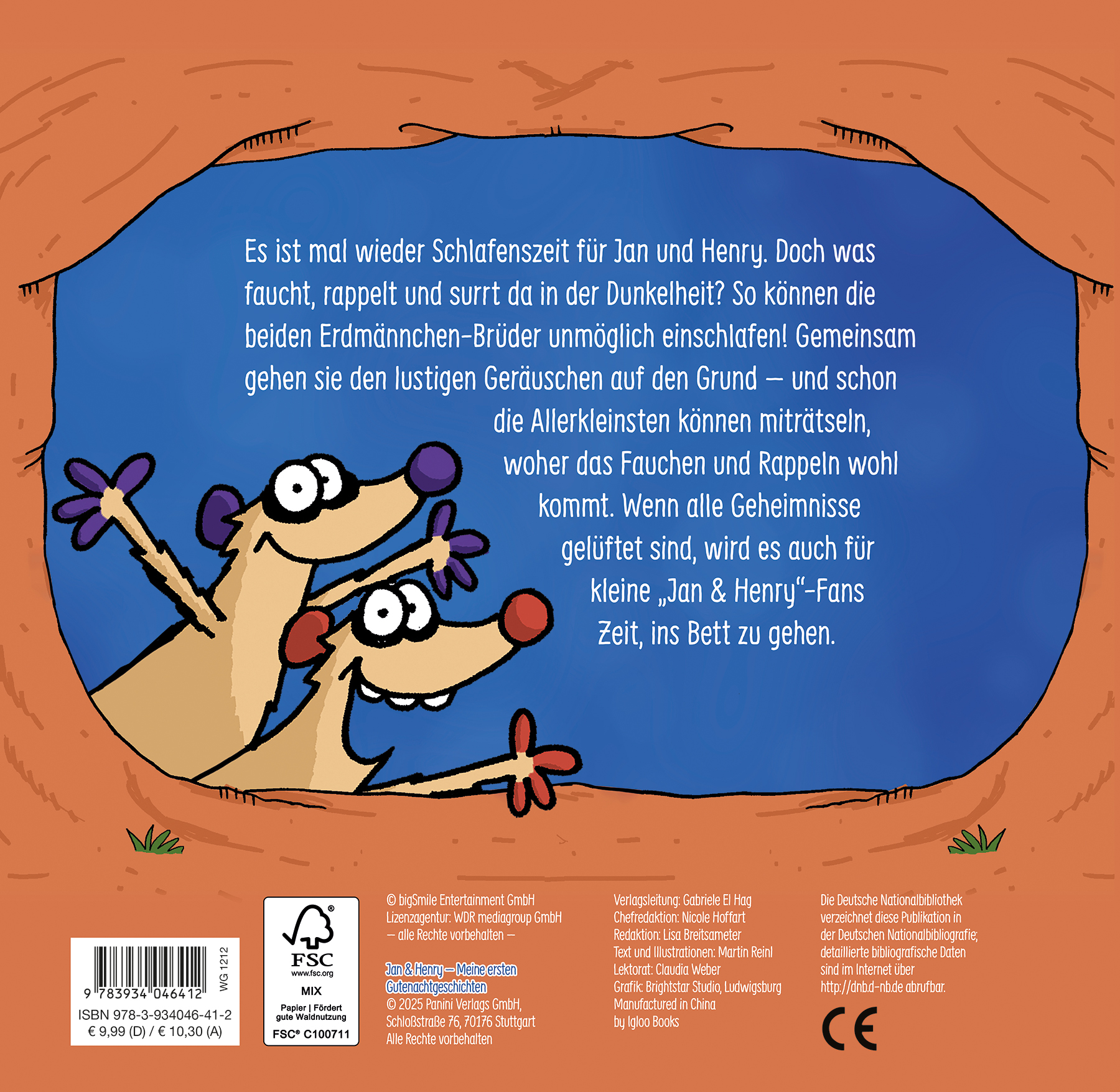 Es ist mal wieder Schlafenszeit für Jan und Henry. Doch was faucht, rappelt und surrt denn da in der Dunkelheit? So können die beiden Erdmännchenbrüder unmöglich einschlafen! Gemeinsam gehen sie den lustigen Geräuschen auf den Grund – und schon die Allerkleinsten können miträtseln, woher das Fauchen und Rappeln wohl kommt. Dieses Pappbilderbuch mit hochwertiger Ausstattung präsentiert zwei unterhaltsame Geschichten von „Jan & Henry“ zum Mitraten und Schmunzeln und glücklichen Einschlafen.