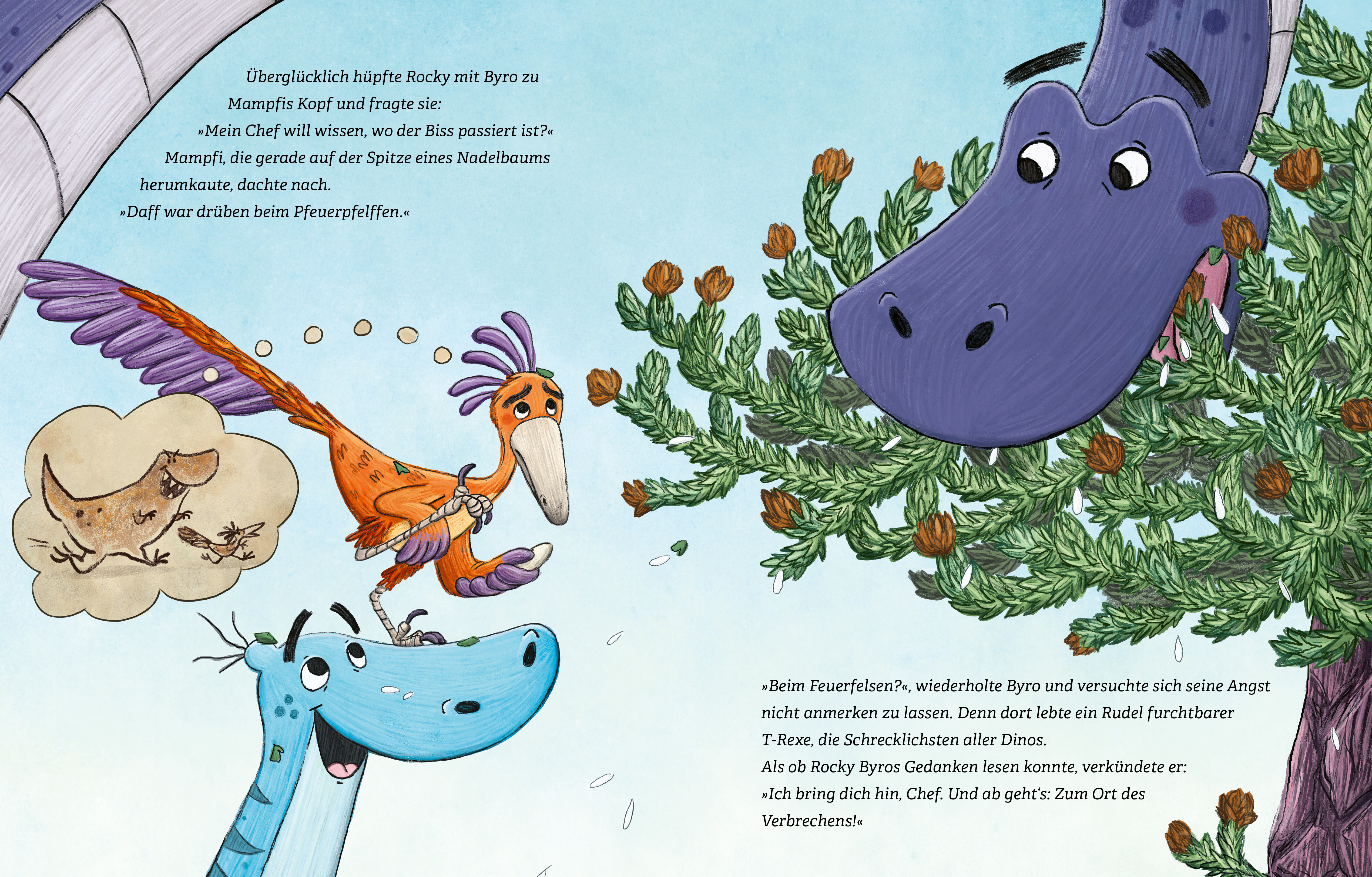 Dino-Detektiv Byro, ein waschechter Byronosaurus jaffei, wartet auf seinen nächsten Fall. Und es dauert nicht lange, da beauftragt ihn die Puertasaurus-Dame Mampfi: Jemand hat ihr in den Po gebissen! Byro soll herausfinden, wer das war. Auf der Suche nach dem Täter wird Byro unterstützt von Rocasaurus Rocky - wenn auch widerwillig. Doch schnell erkennt Byro: Gemeinsam lässt sich viel besser ermitteln!