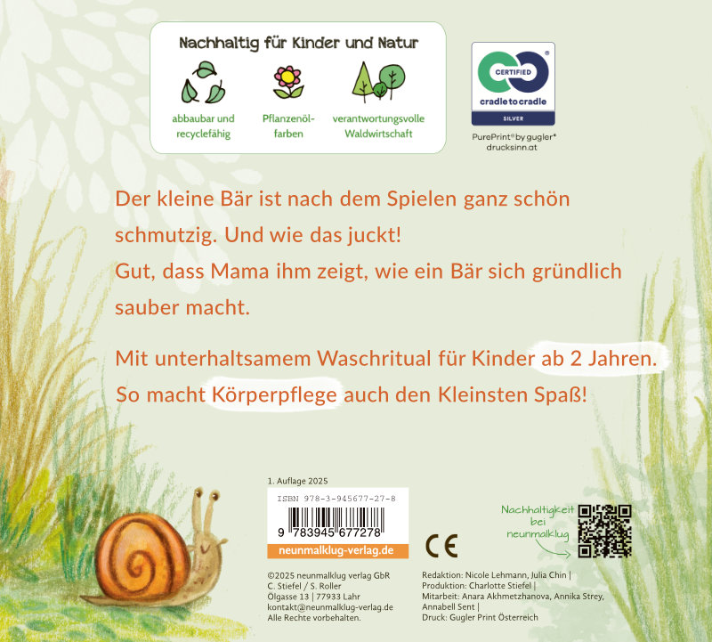| Schlagworte | Bär • charmante Illustrationen • Cradle to Cradle • Eltern-Kind-Bindung • Geborgenheit • Hygienetipps • Jucken und Kratzen • Körperpflege • Mitmachbuch • nachhaltig • Natur und Tiere entdecken • Reime • Sauberkeitserziehung • Umweltfreundlich • ungiftig • Wald • Waschroutine • wichtiger Alltagsbezug |