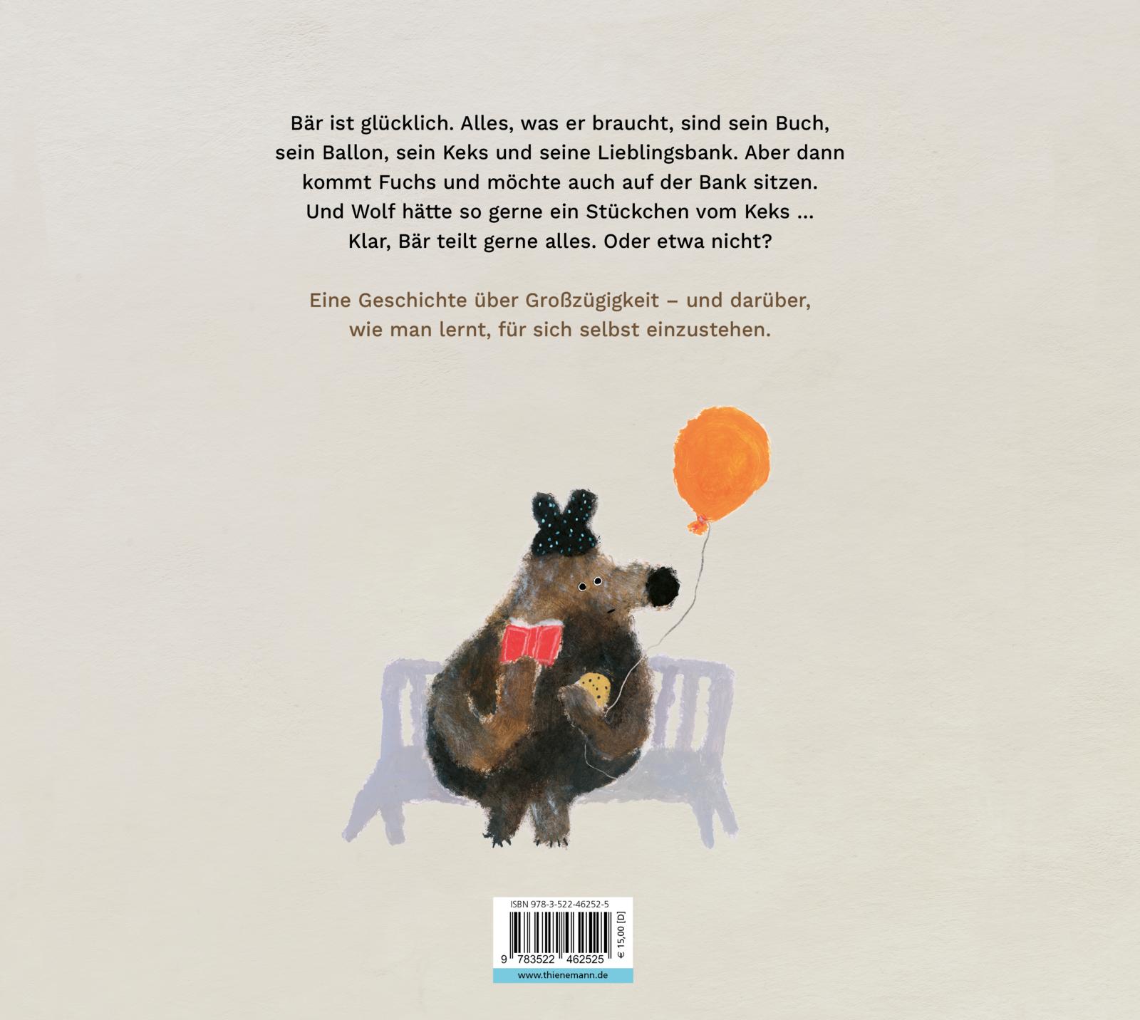 Bär ist glücklich. Alles, was er braucht, sind sein Buch, sein Luftballon, sein Keks und seine Lieblingsbank. Doch als Fuchs, Wolf, Hase und schließlich auch noch Elefant etwas von seinen Schätzen haben wollen, steht Bär vor einer großen Herausforderung: Soll er wirklich teilen? Diese humorvolle und einfühlsame Geschichte zeigt Kindern, wie schwierig es manchmal sein kann, die eigenen Bedürfnisse wahrzunehmen und auszudrücken. Mit seinen ausdrucksstarken, wolligen Illustrationen und der liebenswerten Hauptfigur des Bären hilft Natalia Shaloshvilis "Bär" Kindern, ihre eigenen Gefühle besser zu verstehen.