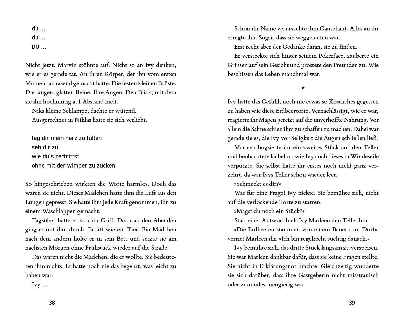 Ivy ist auf der Flucht. Vor wem oder warum, daran erinnert sie sich nicht. Sie kennt nur ihren Vornamen. Ohne Geld, Handy und Papiere, ausgehungert und mit fremdem Blut an den Kleidern findet sie Unterschlupf in der Pension eines kleinen Orts. Als sie allmählich anfängt, sich zu erinnern, weiß sie, dass sie auch hier nicht sicher ist. Sie taucht in einem Ferienort am Meer unter und findet Arbeit im Bistro eines Strandhotels. Doch in den Nächten wird sie immer wieder von Albträumen heimgesucht - was hat sie gesehen? Und wieso will sie auf gar keinen Fall zur Polizei gehen?