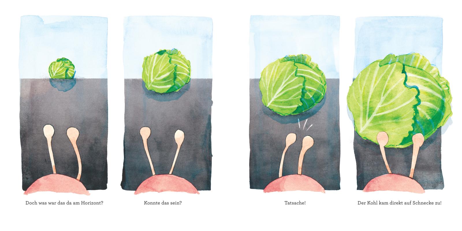 Lecker! Als Schnecke auf der anderen Straßenseite grüne Kohlköpfe erspäht, ist klar: Nichts und niemand kann sie aufhalten! Unbeirrt kriecht sie auf ihr Ziel zu und trotzt allen Gefahren. Als es zu regnen beginnt, lädt sie eine Gruppe verängstigter Ameisen zum Tee in ihr Schneckenhaus ein. So viel Zeit muss sein! Nach dem Schauer kriecht Schnecke entschlossen weiter. Doch dann gibt es eine böse Überraschung. Muss Schnecke etwa auf den Kohl verzichten?