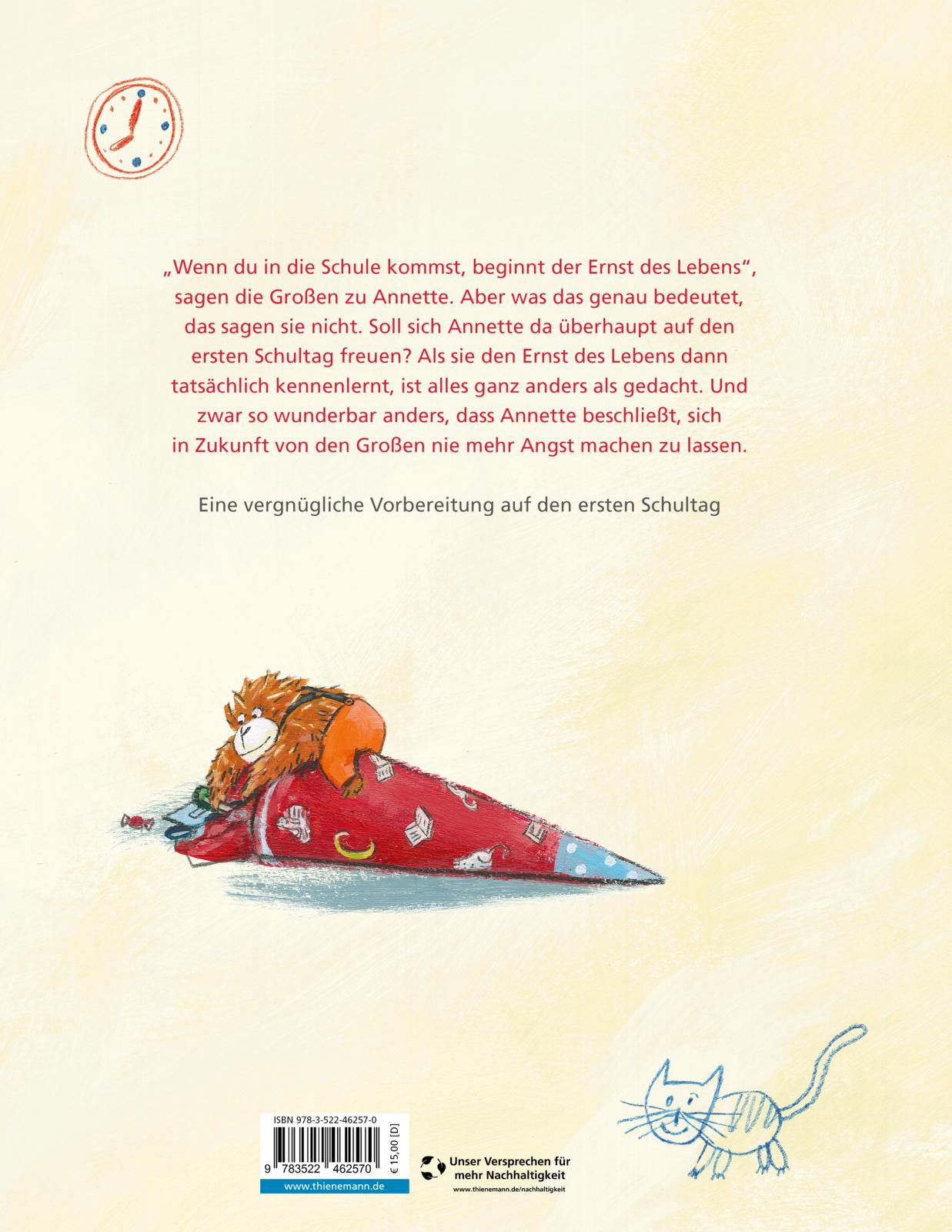 Wenn man in die Schule kommt, dann beginnt der Ernst des Lebens. Das hat Annette schon oft gehört. Aber was dieser Ernst des Lebens genau ist, das weiß sie nicht so recht. Als Annettes erster Schultag schließlich gekommen ist, begegnet sie ihm tatsächlich, dem Ernst. Er ist ihr Sitznachbar, und zusammen mit ihm macht Lesen- und Schreibenlernen gleich noch mal so viel Spaß. Annette ist froh, dass sie den Ernst des Lebens nun endlich kennengelernt hat.