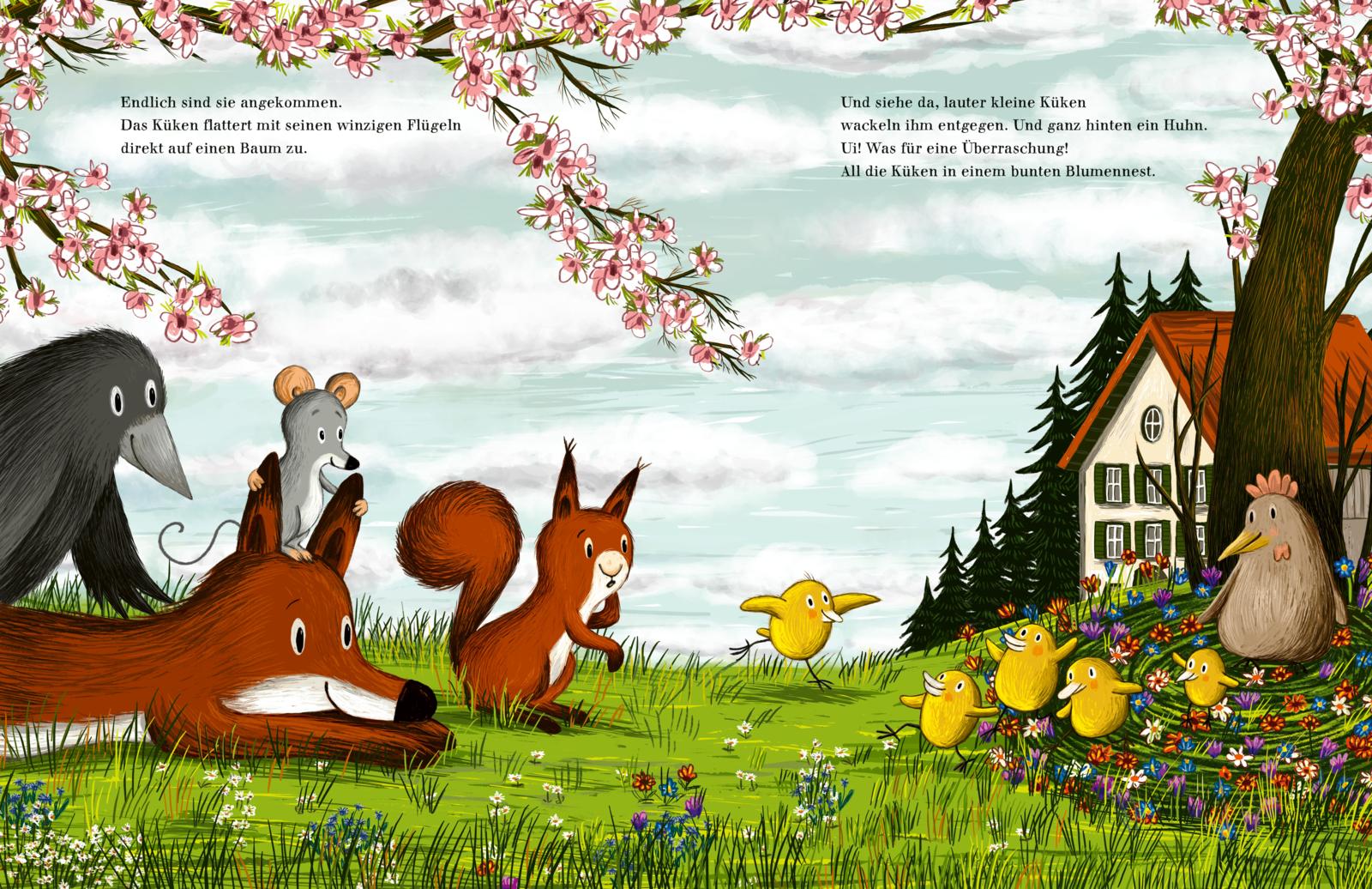 Die Tage werden länger, die Sonne wärmt Fell und Federn, und Maus, Fuchs und Rabe genießen den Frühling in vollen Zügen. Auch das Eichhörnchen ist wieder da und hat eine Überraschung für seine Freunde! Neugierig folgen sie ihm durch blühende Wiesen und leuchtende Rapsfelder. Unterwegs entdecken sie ein kleines Küken, das sich verlaufen hat. Gemeinsam bringen sie es nach Hause und erleben dabei etwas, das den Frühling noch schöner macht.