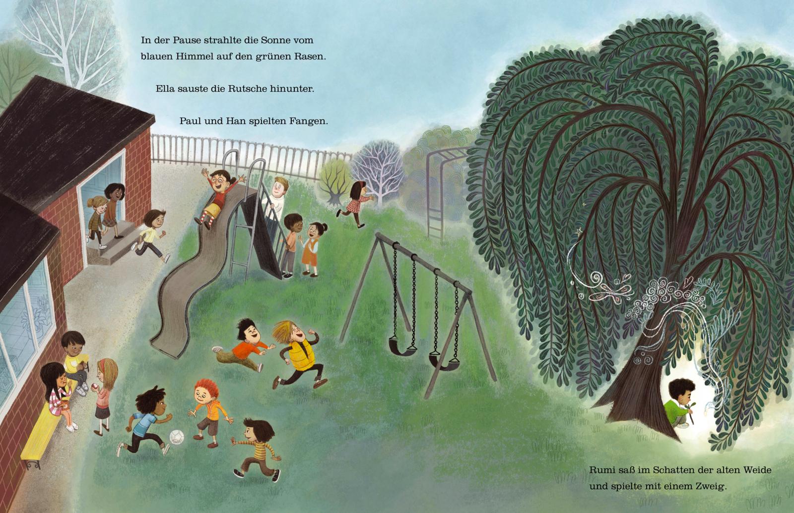 Rumi ist noch neu in der Klasse, in der Pause spielt er am liebsten allein unter der großen Weide. Bis er ein Kichern hört: Andere Kinder machen sich über ihn lustig. Erst treffen ihn ihre Worte, dann ein Stein. Bis Rumis Mitschüler Han beschließt, dass er nicht länger zuschauen kann. Er möchte Rumis Freund werden.