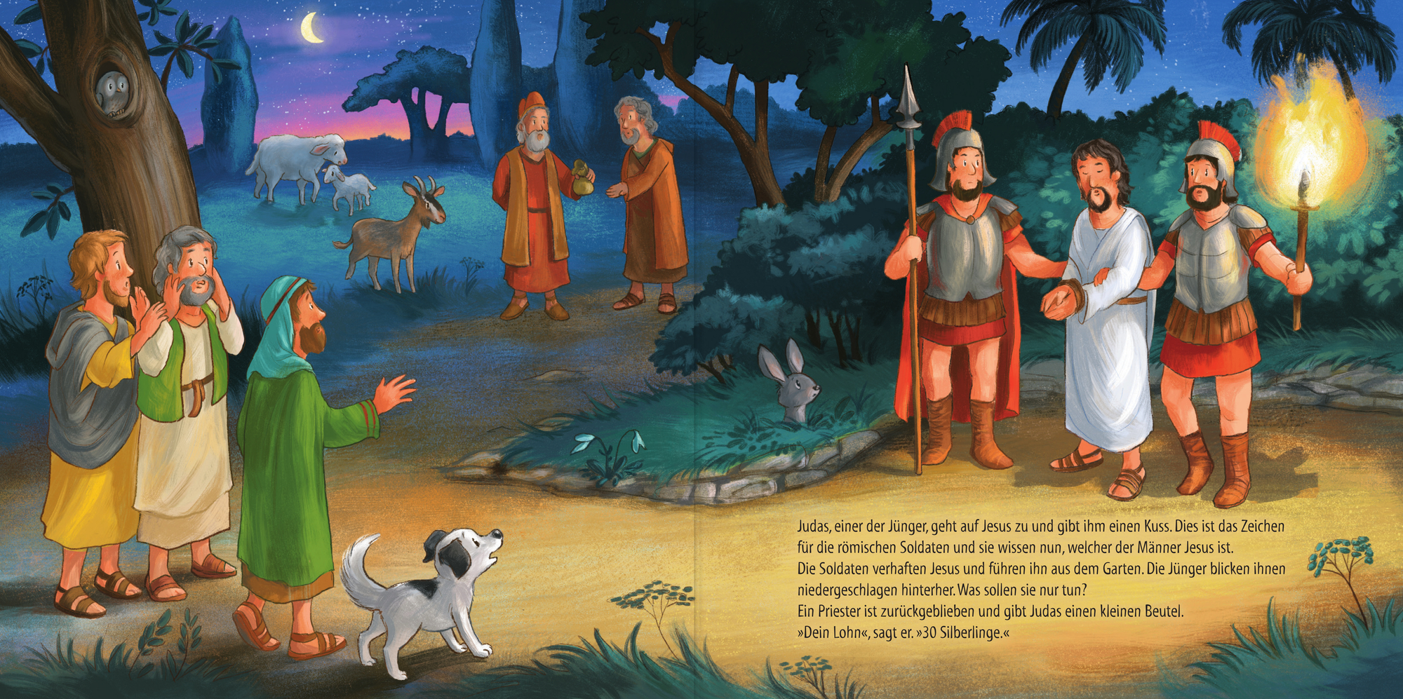 Vorlesen und Spielen - Die Ostergeschichte für Kinder ab 4 Jahren. Das Bilderbuch enthält 12 Steckfiguren, sie können nach und nach passend zur Geschichte herausgenommen und zum Spielen auf der integrierten Spielschiene angeordnet und zu einer Szene zusammengestellt werden.