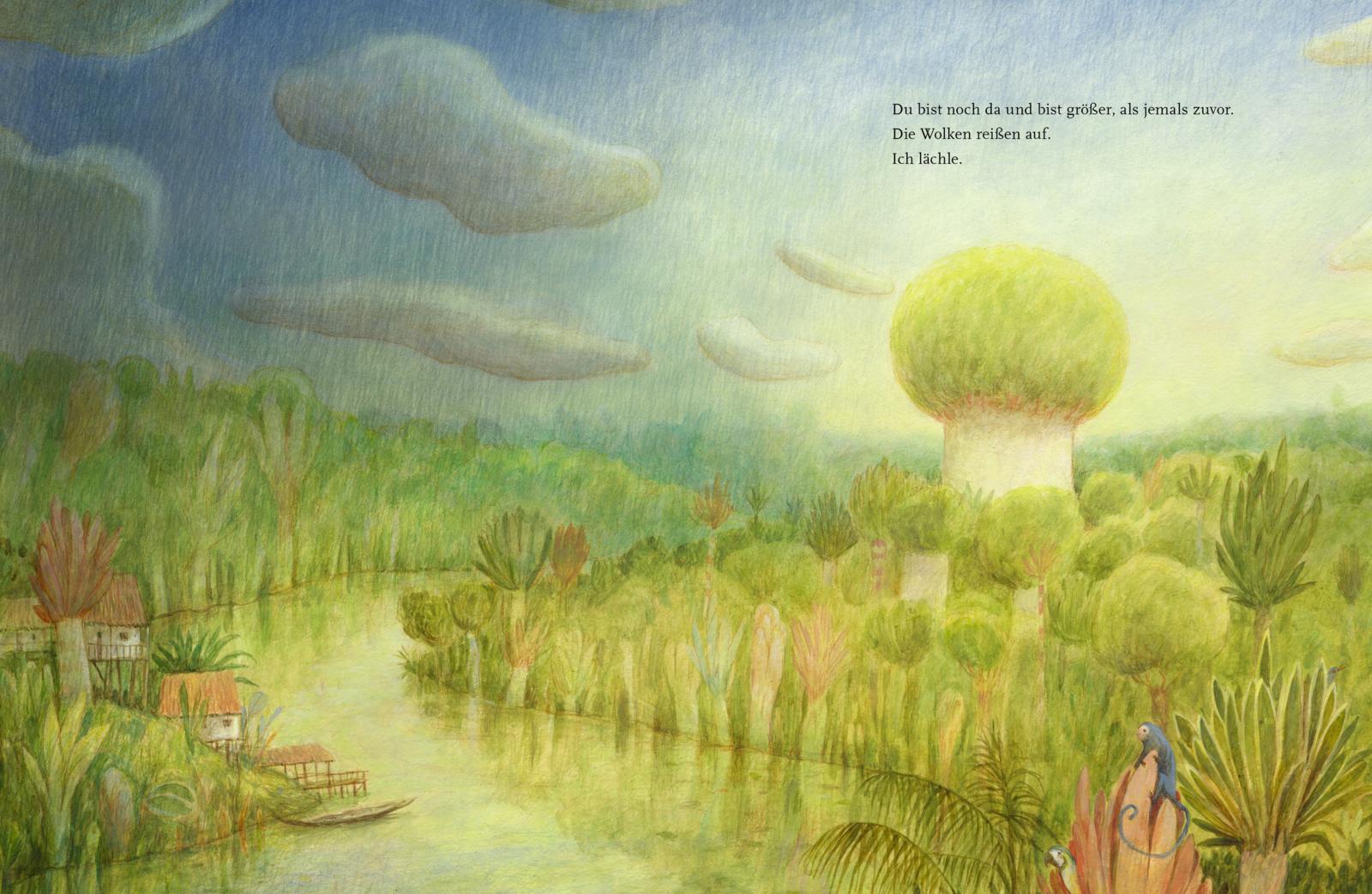 Das Waldmädchen hört einen Schrei - ihr geliebter Baum wurde gefällt. Sie eilt zu ihrem Freund, um sich von ihm zu verabschieden, noch einmal seinen Duft aufzunehmen und seinen Herzschlag zu spüren. Doch dann ... wacht das Waldmädchen auf, und was für ein Glück: Ihr Baum ist noch da und er ist größer, lebendiger und grüner als jemals zuvor! Sie klettert hinauf bis in seine Krone, betrachtet die Welt von oben und gemeinsam lauschen sie den vielen leisen und lauten Stimmen der Erde.