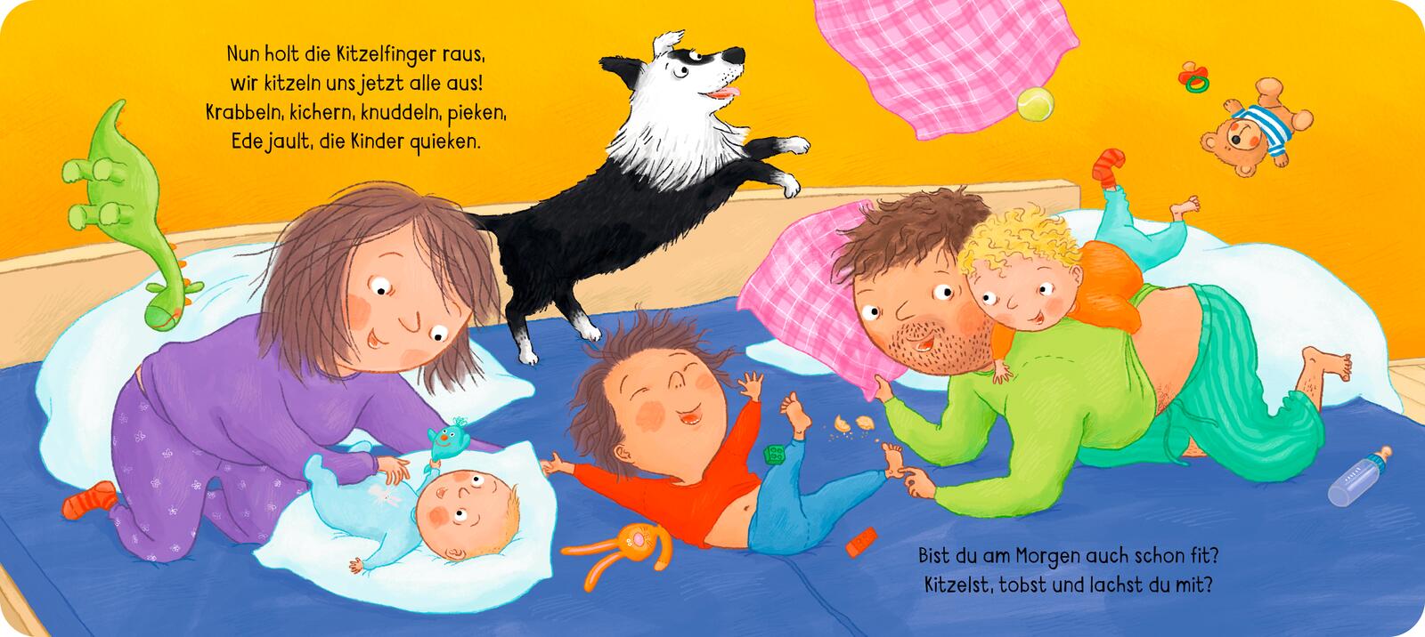Ein neuer Tag beginnt und im gemütlichen Familienbett öffnen alle nacheinander die Augen. Der kleine Bela kuschelt sich in Mamas Arm. Seine Schwester Lou ist schlecht gelaunt und will weiterschlafen. Baby Todd ist fit und fröhlich. Und Hund Ede kaut an Papas Hose und will am liebsten alle wachschlecken. Alle zeigen auf ihre Weise, dass unterschiedliche Stimmungen am Morgen einfach dazugehören. Dabei darf es auch mal etwas chaotisch sein - Hauptsache, alle fühlen sich wohl. Und dann kann sich sogar ein Grummel-Morgen mit einer liebevollen Kitzelschlacht in einen Sonnenschein-Morgen verwandeln.