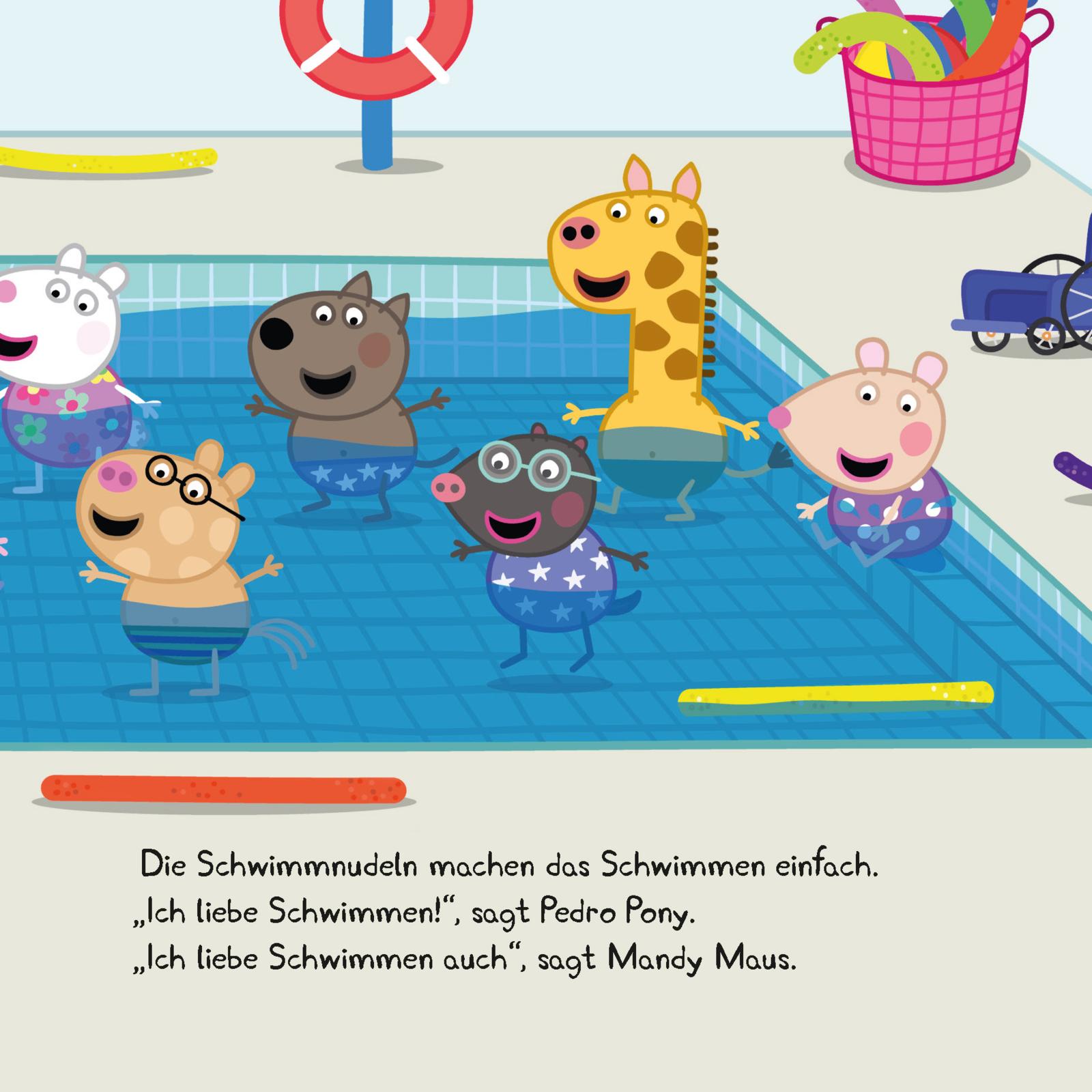 Peppa ist aufgeregt. Heute geht es ins Schwimmbad. Frau Mümmel ist die Schwimmlehrerin und gibt Peppa und ihren