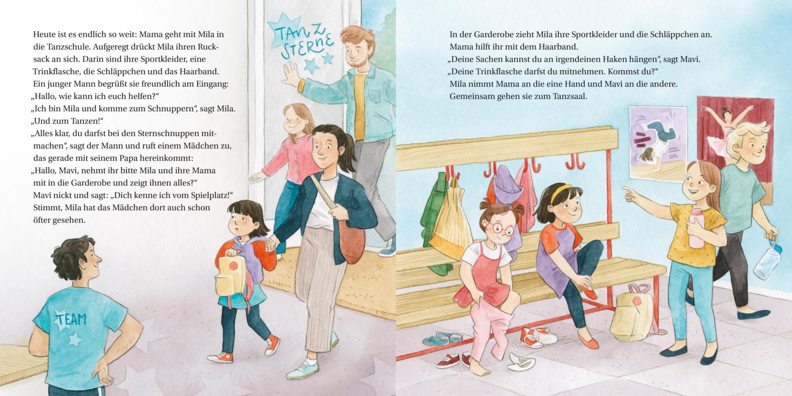 Mila freut sich riesig: Sie darf zum Kindertanzen gehen. Im großen Saal in der Tanzschule ist viel Platz zum Springen und Tanzen. Mila und die anderen Kinder hüpfen im Takt der Musik, balancieren auf Zehenspitzen, machen große Froschsprünge und üben gemeinsam einen Schmetterlingstanz.