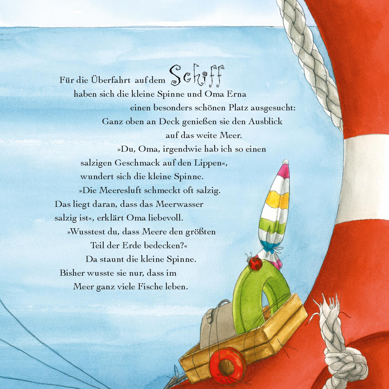 Die kleine Spinne Widerlich muss ihren Koffer packen: Gemeinsam mit Oma Erna macht sie Ferien am Meer. Sie lernt Mats, die Matrosenspinne, kennen und staunt über Ebbe und Flut, Muscheln und Wattwürmer. Was es am Meer doch alles zu entdecken gibt!