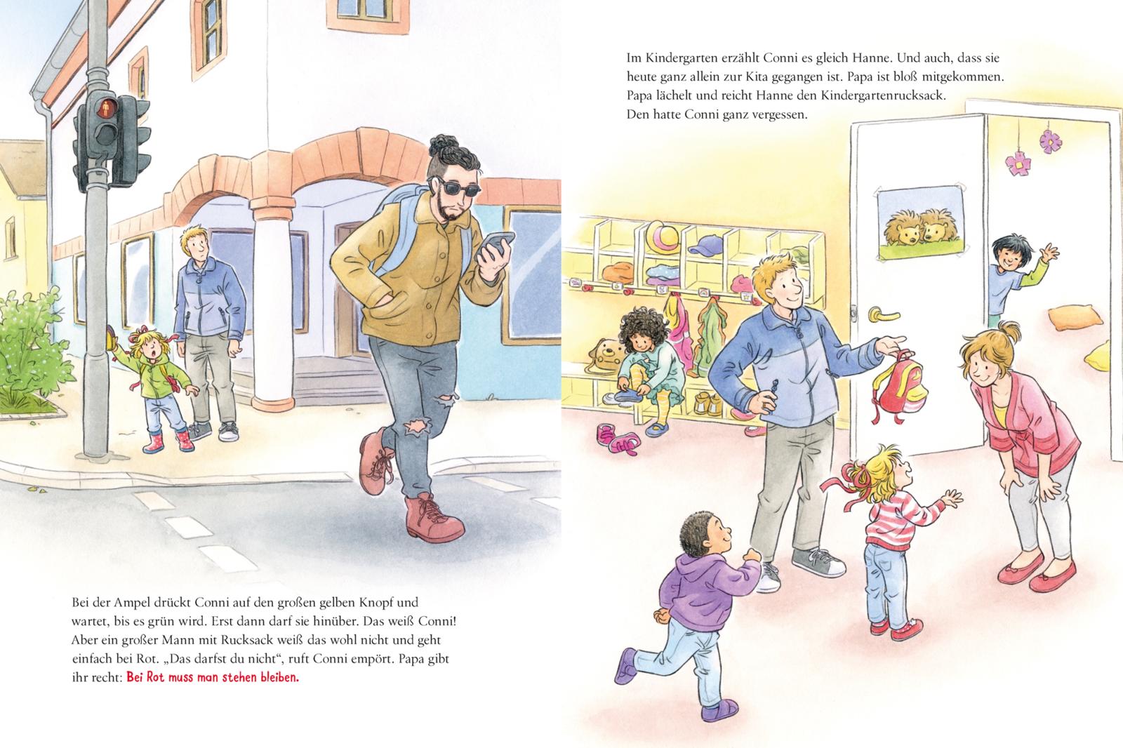 Klar kann sie sich alleine anziehen: sogar mit Stiefeln. Auch ihr Brötchen kann Conni bestreichen - sie kleckert dabei nur ein ganz kleines bisschen. Der Kakaofleck, der sich auf der Tischdecke ausbreitet, macht ihr nichts aus. Sogar in den Kindergarten geht Conni alleine. Na gut, Papa ist dabei und passt auf. Und an den Kita-Rucksack denkt er zum Glück auch! Was Conni alles schon kann, erzählt dieses Bilderbuch. Es ermuntert Kinder in ihren Streben nach Autonomie und zeigt, dass Dinge auch schiefgehen dürfen.