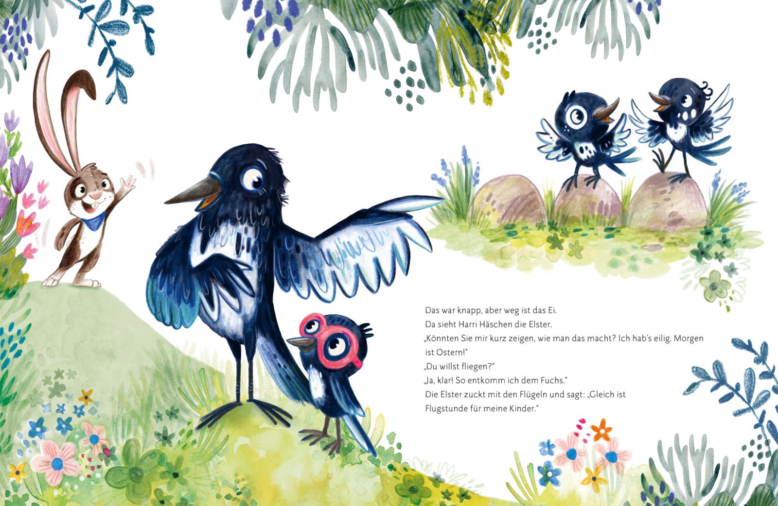Als durch einen Unfall im Hasenbau die bemalten Eier kaputt gehen, müssen schnell neue Ostereier von den Hühnern geholt werden. Eigentlich ist Harri Häschen dafür noch zu klein, finden seine Eltern. Doch das Hasenkind will endlich beweisen, was in ihm steckt! Also hoppelt Harri los. Leider stellt er schon bald fest, dass Hoppeln ganz schön langsam ist. Da kommt ihm die rettende Idee: Fliegen müsste man können! Wer ihm das wohl beibringen könnte? Zum Glück findet Harri eine geeignete Lehrerin. Leider geht bei den ersten Flugversuchen das ein oder andere Ei in die Brüche. Doch Harri ist ein schlaues Häschen und findet schnell eine Lösung. Er bringt die Eier im Sausewind, mit Propellerohren und Halstuch-Tasche zu seiner malenden Hasenfamilie. Und welcher Nachwuchs-Osterhase darf wohl am Ostermorgen die Nester verstecken?