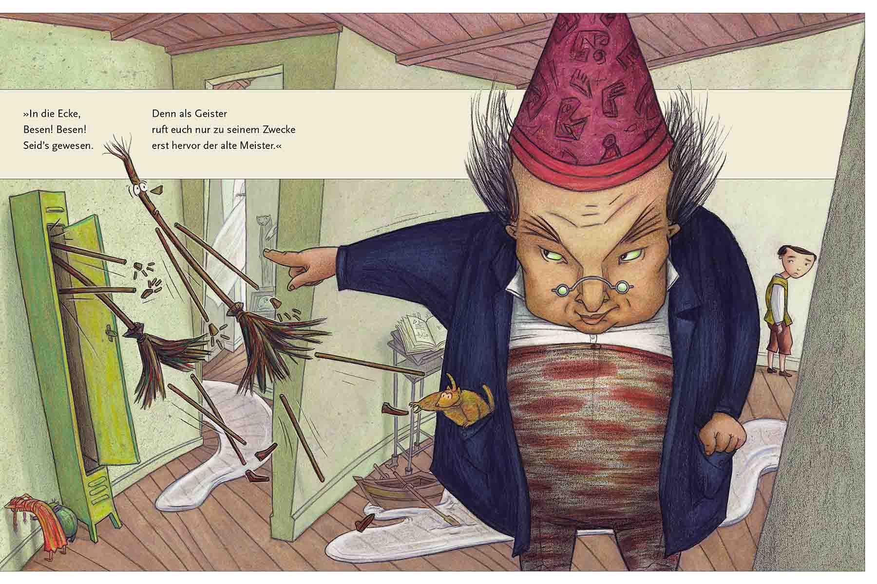 Wer kennt sie nicht, die Geschichte vom frechen Zauberlehrling, der hinter dem Rücken seines Meisters die Besen tanzen lässt und dabei ziemlich nasse Füße bekommt? In dieser kleinformatigen Bilderbuchausgabe entfalten die Illustrationen von Sabine Wilharm den ganzen Zauber und das Chaos, das der Lehrling heraufbeschwört, als er die Kontrolle über die Geister verliert.