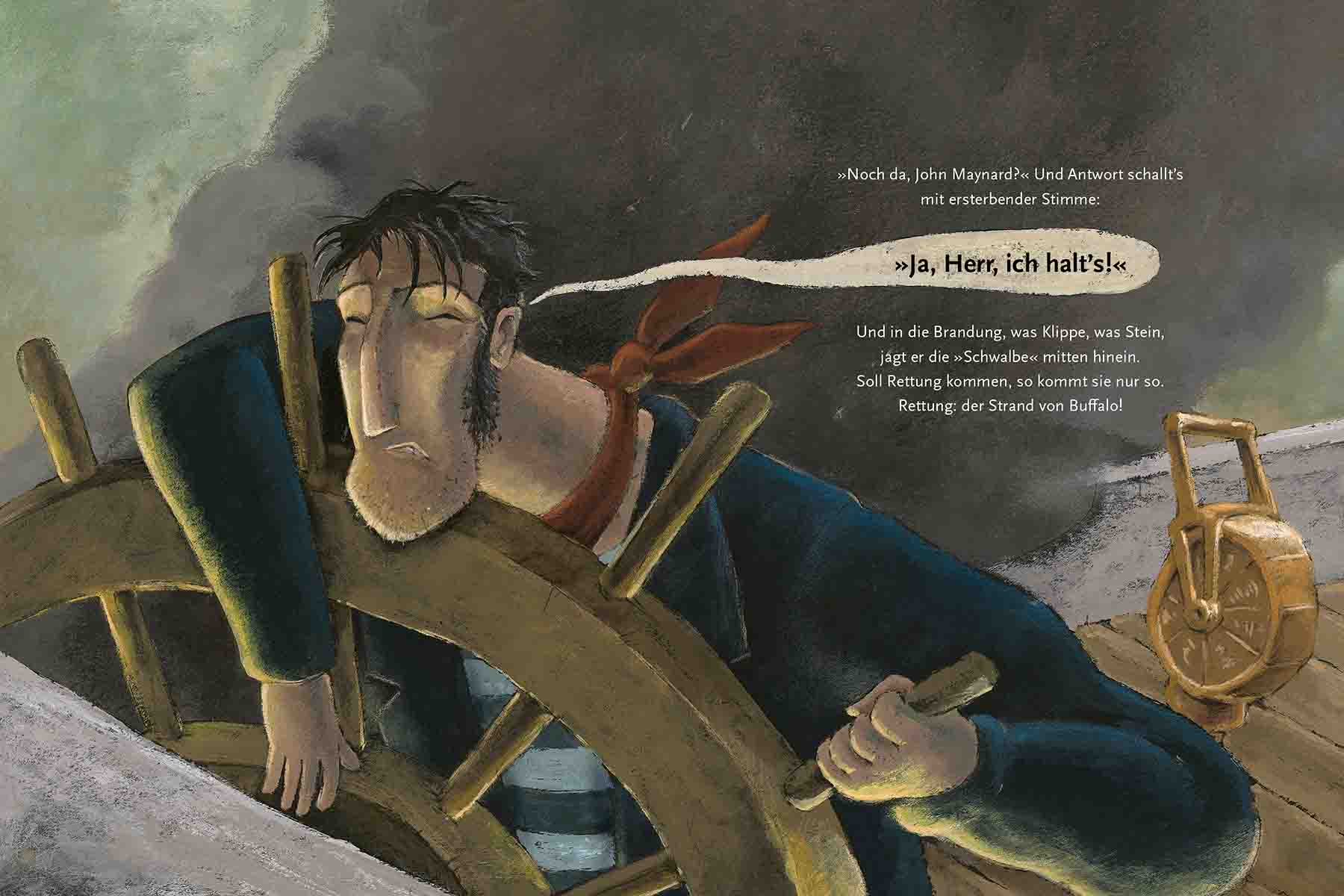 Die lebendigen Illustrationen von Tobias Krejtschi bringen die kraftvollen Worte Fontanes zum Leuchten und lassen das Heldentum John Maynards in all seiner Größe erstrahlen.