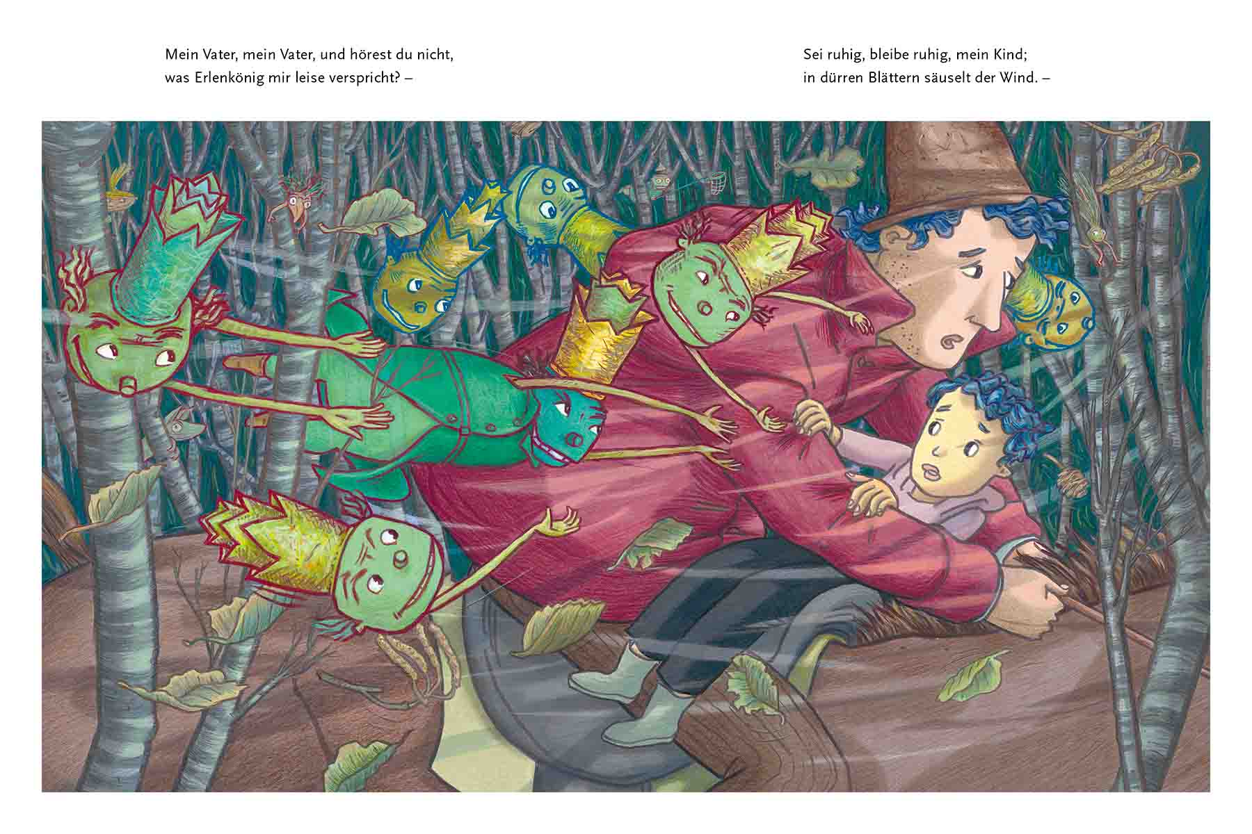 In dieser kleinformatigen Bilderbuchausgabe erwacht das Werk auf eindrucksvolle Weise neu: Sabine Wilharms Illustrationen fangen die geheimnisvolle Stimmung der nächtlichen Jagd und den Sog des Erlkönigs bildgewaltig ein.