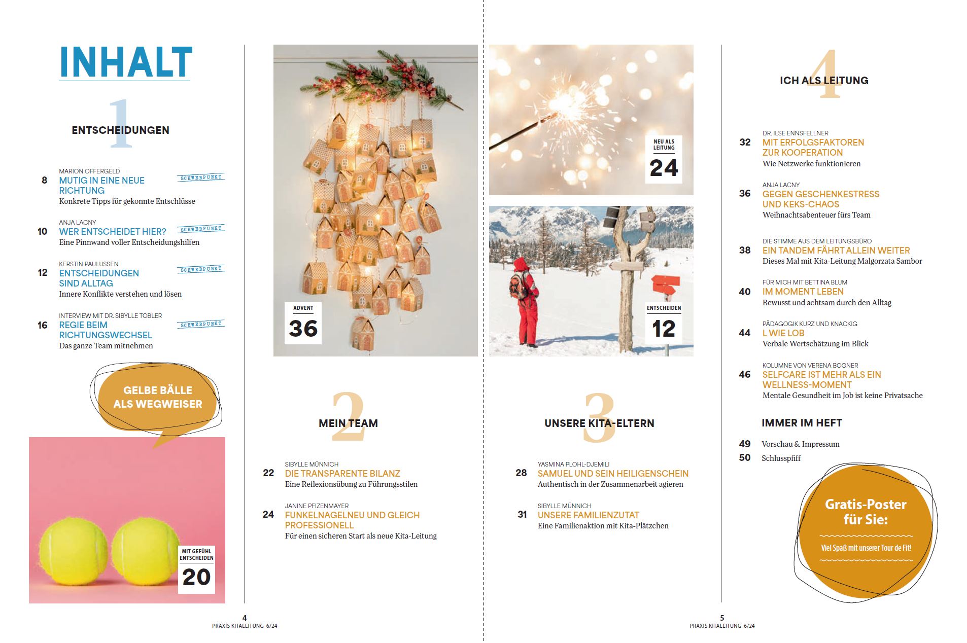 Sich zu entschließen ist nicht immer leicht – doch Alltag jeder Kita-Leitung. Darum beschäftigt sich die neue Ausgabe mit dem Thema: Entscheidungen treffen. Wir werfen einen Blick auf die inneren Konflikte, welche Methoden uns helfen sie aufzulösen und welche Entscheidungs-Typen es gibt. Außerdem lesen Sie in dieser Ausgabe: Wie der Halo-Effekt auf Eltern wirkt, warum Selfcare mehr als nur ein Wellness-Moment ist und welche Weihnachtsabenteuer es für Ihr Team gibt.