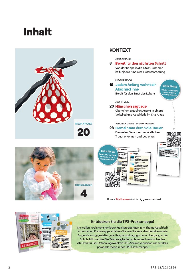 | Schlagworte | Abgeben • Abolen • Abschied • Abschiedskultur • Ankommen • Bilderbücher • Biografie • Biografiearbeit • bringen • Eltern • Filme • Kinder • Kita • Krippe • Podcast • Reflexion • Reflexionsfragen • Schule • Stress • Tod • Transition • Trauer • Überforderung • Übergänge • verabschieden • Vorerfahrung |