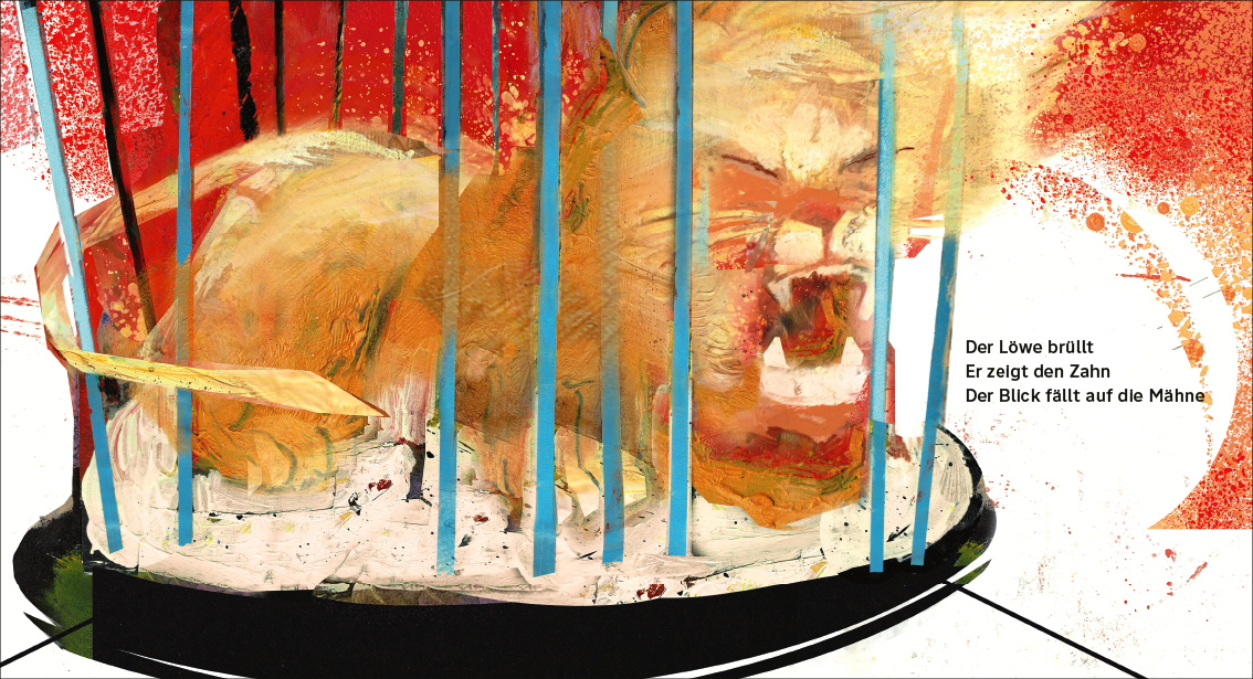 Ein Mädchen träumt den eigenen Körper als Landschaft: In ihrer Hand liegt der Dschungel, im Haar sitzt mit wehender Mähne ein Löwe. Auf ihrem Bein steht ein Zirkuszelt. Der Direktor ist ein grober Mann, gierig nach Erfolg und Sensation fängt er den stolzen Löwen ein. Doch als die Peitsche knallt und der Löwe springt, ermächtigt sich die Träumende: Mir reicht das jetzt! Das ist mein Traum, ich lass die Erde beben! Das Gefängnis des Löwen stürzt ein, das Mädchen stellt ihn zurück in seine Welt. In farbintensiven Bildern erzählt Ulrike Möltgen ihre Traumgeschichte. Sie fesselt den Blick mit fein ausgeführten Details und durch die Sinnlichkeit ihrer Illustration: Mit pastos aufgetragenen Ölfarben, pudrigen Kreiden, gespannten Schnüren und aufwendigen Collagen erschafft sie eine Welt, die kleine und große Betrachter:innen sofort einfängt und lange festhält.
