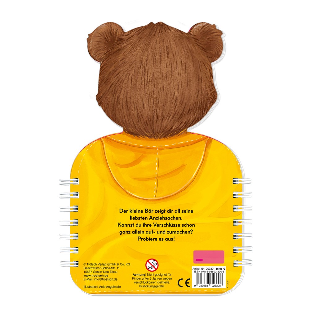 Ob Reißverschluss, Schleife oder Knopf: Mit dem fröhlichen Bären lernen schon die Kleinsten, unterschiedliche Verschlüsse auf- und wieder zuzumachen. Kleine Aufforderungen ermuntern zum wiederholten Ausprobieren und machen den Bären so zu einem Spielgefährten, der beim Erlernen motorischer Fähigkeiten hilft. Mit fünf verschiedenen Verschlüssen.