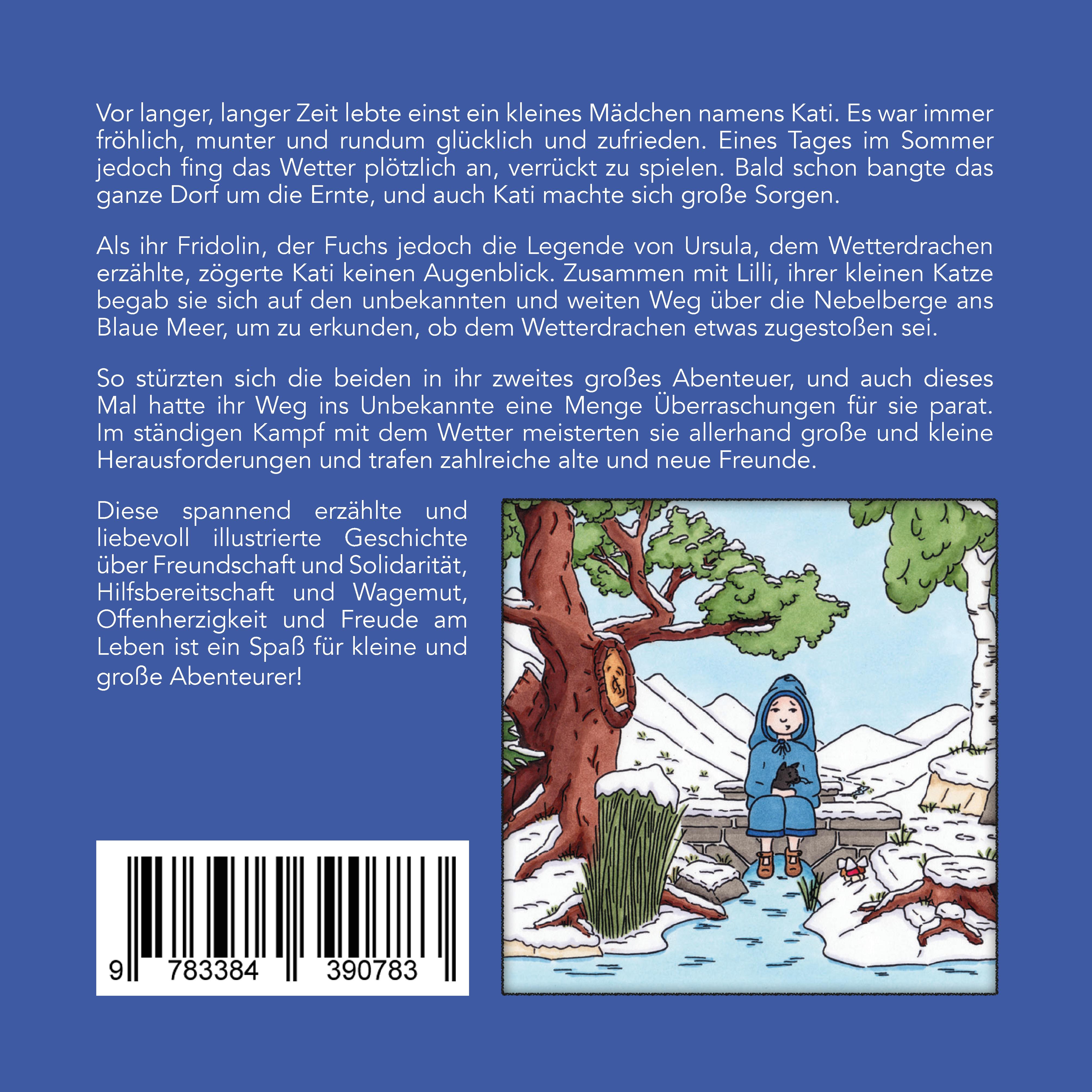 Vor langer, langer Zeit lebte einst ein kleines Mädchen namens Kati. Es war immer fröhlich, munter und rundum glücklich und zufrieden. Eines Tages im Sommer jedoch fing das Wetter plötzlich an, verrückt zu spielen. Bald schon bangte das ganze Dorf um die Ernte, und auch Kati machte sich große Sorgen.Als ihr Fridolin, der Fuchs jedoch die Legende von Ursula, dem Wetterdrachen erzählte, zögerte Kati keinen Augenblick. Zusammen mit Lilli, ihrer kleinen Katze begab sie sich auf den unbekannten und weiten Weg über die Nebelberge ans Blaue Meer, um zu erkunden, ob dem Wetterdrachen etwas zugestoßen sei.So stürzten sich die beiden in ihr zweites großes Abenteuer, und auch dieses Mal hatte ihr Weg ins Unbekannte eine Menge Überraschungen für sie parat. Im ständigen Kampf mit dem Wetter meisterten sie allerhand große und kleine Herausforderungen und trafen zahlreiche alte und neue Freunde.