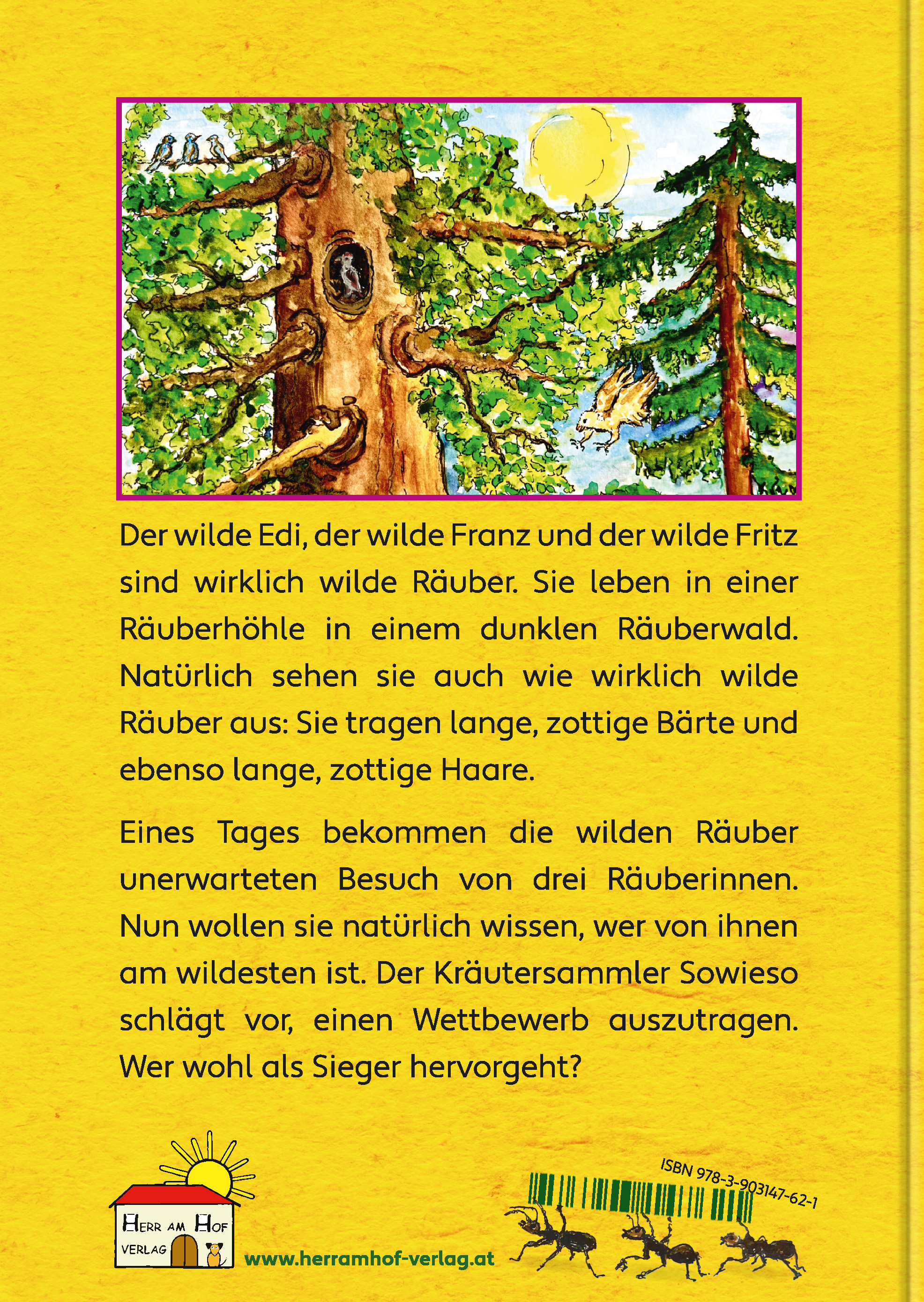 Der wilde Edi, der wilde Franz und der wilde Fritz sind wirklich wilde Räuber. Sie leben in einer Räuberhöhle in einem dunklen Räuberwald. Natürlich sehen sie auch wie wirklich wilde Räuber aus: Sie tragen lange, zottige Bärte und ebenso lange, zottige Haare.Eines Tages bekommen die wilden Räuber unterwarteten Besuch von drei Räuberinnen. Nun wollen sie natürlich wissen, wer von ihnen am wildesten ist. Der Kräutersammler Sowieso schlägt vor, einen Wettbewerb auszutragen. Wer wohl als Sieger hervorgeht?