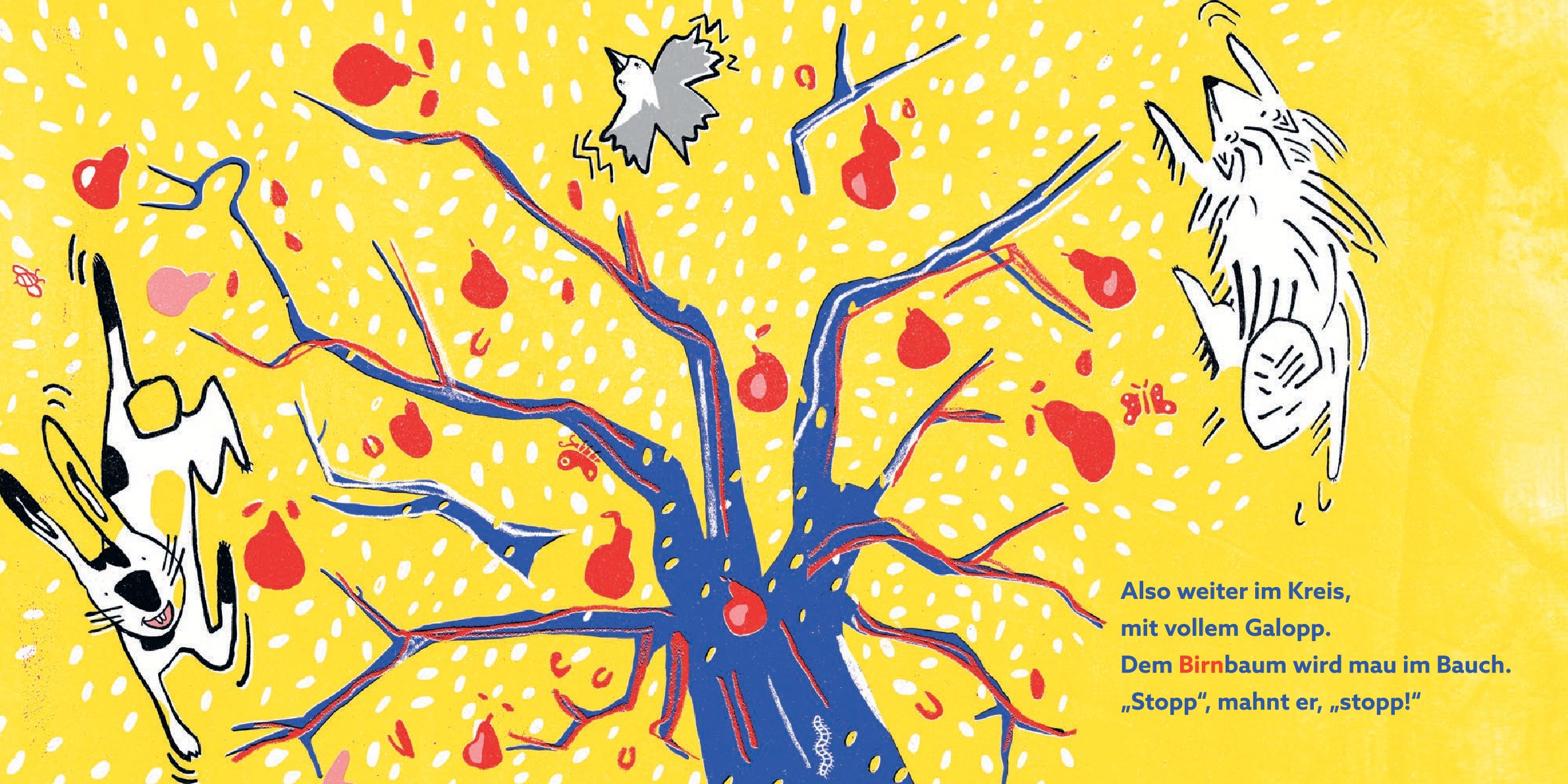 Zwischen Hoppelhase Schnifis und Spitz Ludovic ist ein Wettrennen entbrannt: Rund um den Birnbaum geht es in rasender Geschwindigkeit, wieder und wieder und wieder ... bis es dem Baum zu bunt wird und er drastische Maßnahmen ergreift. Das kunterbunte Bilderbuch mit den witzigen Reimen von Melanie Laibl, illustriert von Hemma Bergner, macht einfach Spaß. Die rasante Geschichte von zwei Freunden, die sich nach einer wilden Verfolgungsjagd und dem unvermuteten Eingreifen der Botanik wieder vertragen, sorgt bei jedem Vorlesen für Gelächter!