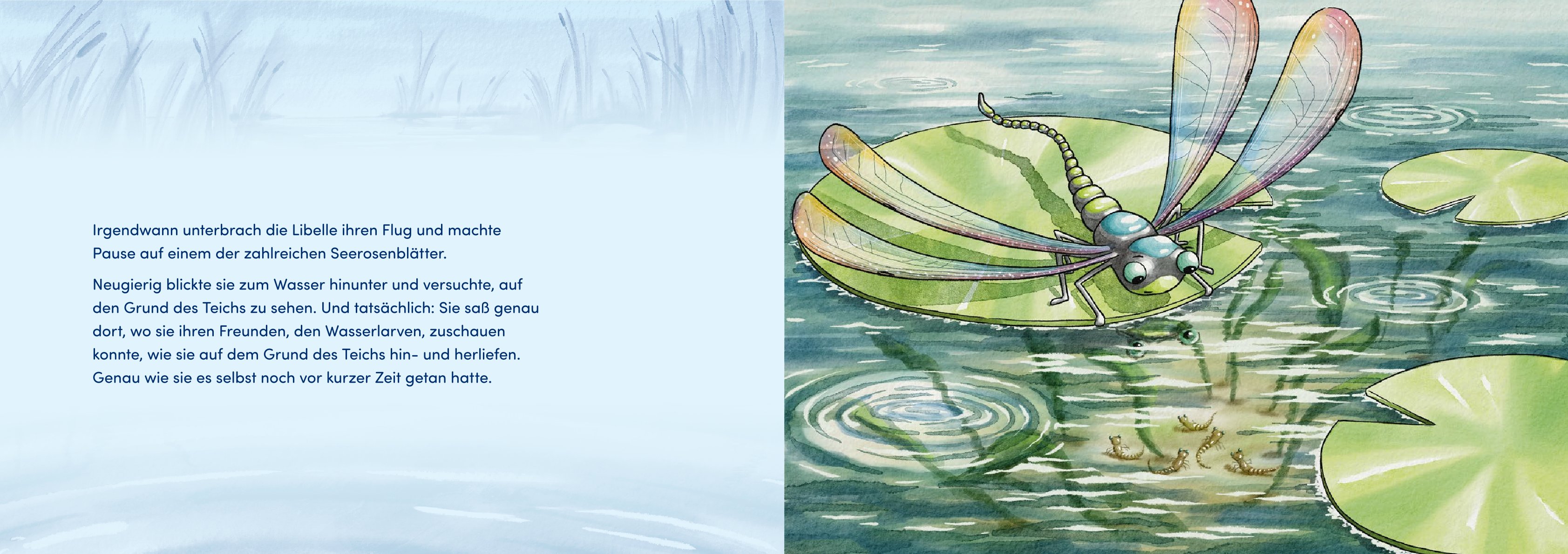 Dieses Kinderbuch zum Thema Tod macht Kinder mit der Endlichkeit des Lebens vertraut, ohne ihnen Angst zu machen. Sie lernen über die Geschichte einer kleinen Larve, die zur Wasseroberfläche klettert und zur Libelle wird, den natürlichen Lebenskreislauf kennen. Das Beispiel aus dem Tierreich bietet Möglichkeiten, das Tabuthema Tod unverkrampft mit Kindern in den Blick zu nehmen und gemeinsam über Tod, Trauer und die Begrenztheit des Lebens nachzudenken.