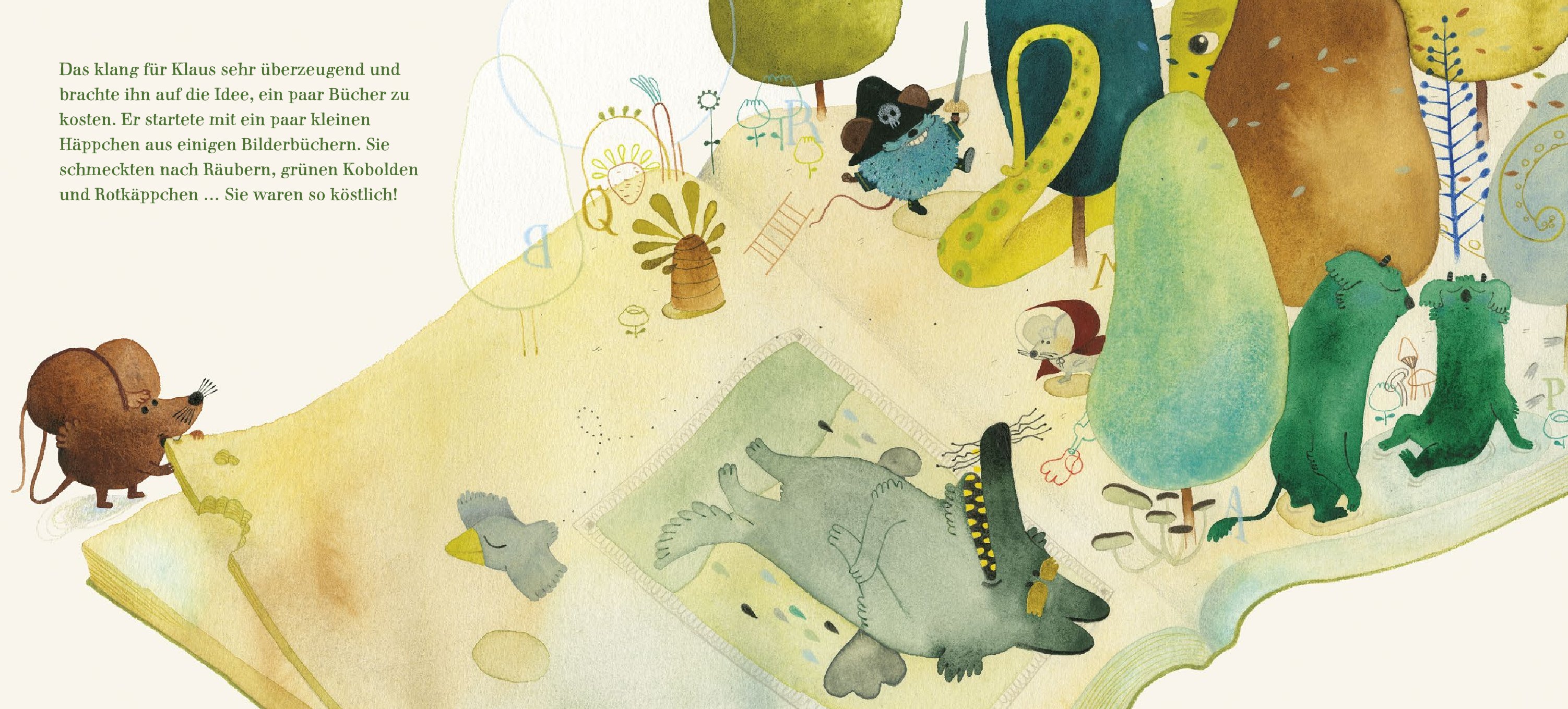 Grüne Kobolde, Abenteuer und verborgene Schätze - erstaunlich, wonach so ein Buch schmecken kann! Zum Glück können Klaus und die Inhaberin des Buchladens sich darauf einigen, dass Bücher gelesen, nicht verspeist werden. Die Büchermaus findet sogar einen Weg, viele neue Besucher:innen in das kleine Geschäft zu locken. So verbreitet sich die Buchliebe schnell unter Mensch und Tier.