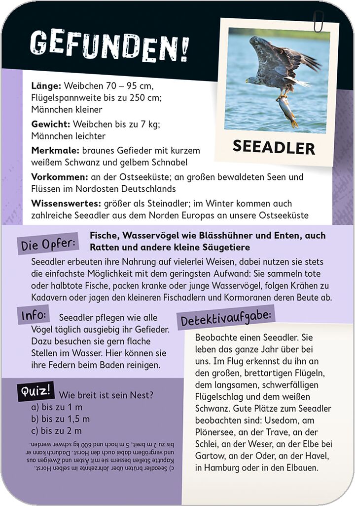 In diesem Kartenset trifft Natur auf Kriminalgeschichten. Jede der 50 Karten zeigt auf der Vorderseite eine Kriminalgeschichte. Hier wird ein Tathergang geschildert. Nun sind die detektivischen Fähigkeiten der Kinder gefragt. Anhand der Geschichte und weiteren Hinweisen können Kinder nun erraten, welches Tier gesucht ist. Die Rückseite verrät die Lösung und liefert zusätzlich spannende Informationen zu den beiden Tieren. Als Bonus warten Detektivaufgaben, Experimente und Quizfragen. Der beiliegende Leporello ordnet die Taten sachlich ein und erklärt, dwieso aus menshclicher Sicht Tatorte in der Natur entstehen.