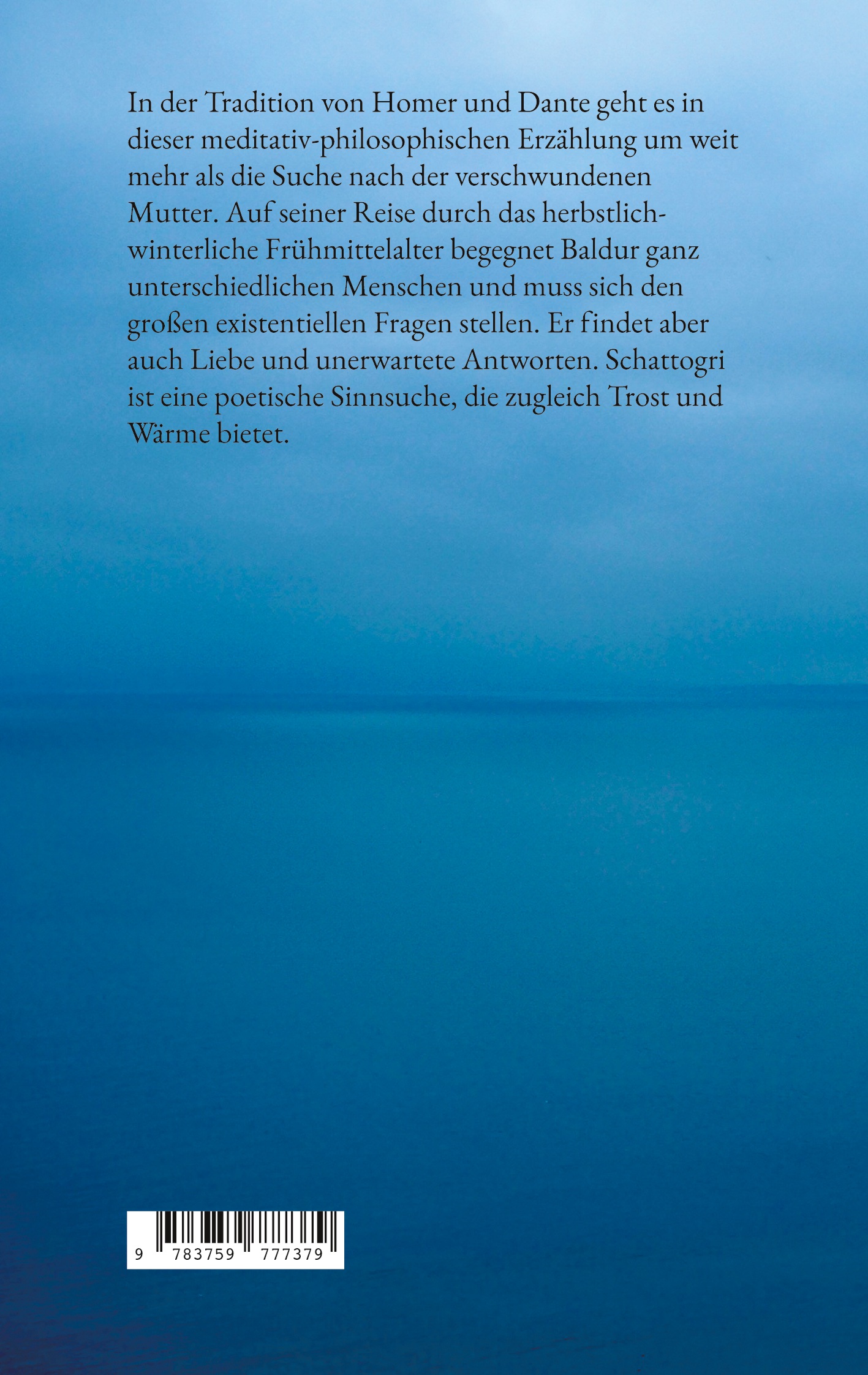 In der Tradition von Homer und Dante geht es in dieser meditativ-philosophischen Erzählung um weit mehr als die Suche nach der verschwundenen Mutter. Auf seiner Reise durch das herbstlich-winterliche Frühmittelalter begegnet Baldur ganz unterschiedlichen Menschen und muss sich den großen existentiellen Fragen stellen. Er findet aber auch Liebe und unerwartete Antworten. Schattogri ist eine poetische Sinnsuche, die zugleich Trost und Wärme bietet.