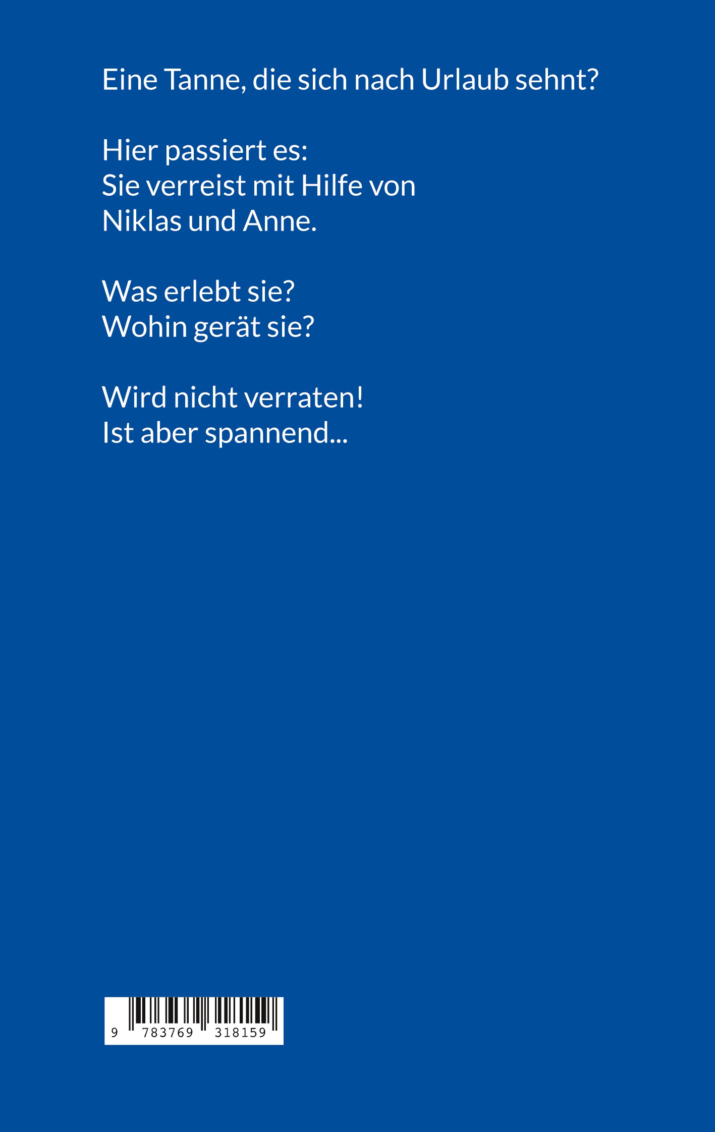 Eine Tanne, die sich nach Urlaub sehnt? Hier passiert es: sie verreist mit Hilfe von Niklas und Anne. Was erlebt sie? Wohin gerät sie? Wird nicht verraten! Ist aber spannend...