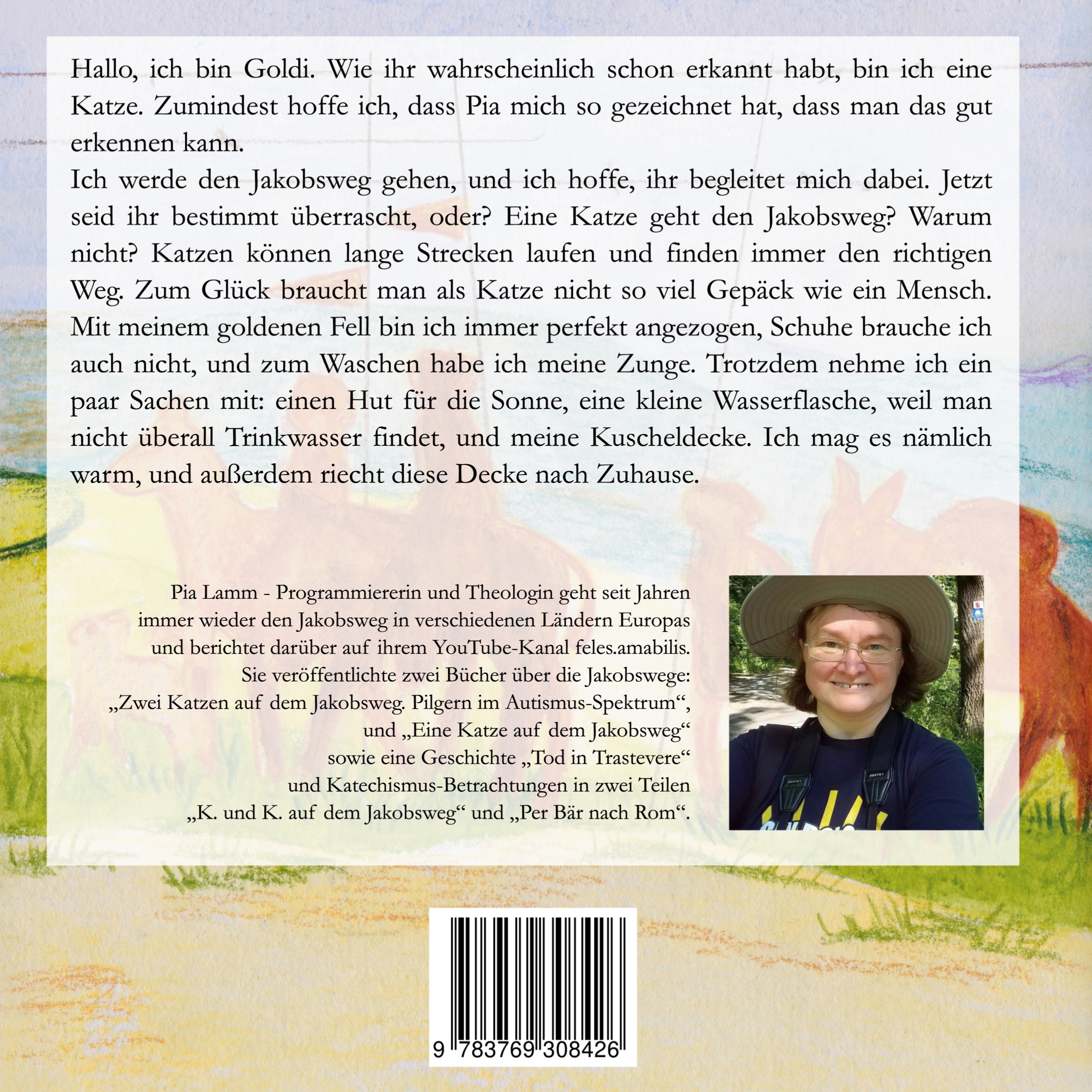 Ich werde den Jakobsweg gehen, und ich hoffe, ihr begleitet mich dabei. Jetzt seid ihr bestimmt überrascht, oder? Eine Katze geht den Jakobsweg? Warum nicht? Katzen können lange Strecken laufen und finden immer den richtigen Weg. Zum Glück braucht man als Katze nicht so viel Gepäck wie ein Mensch. Mit meinem goldenen Fell bin ich immer perfekt angezogen, Schuhe brauche ich auch nicht, und zum Waschen habe ich meine Zunge. Trotzdem nehme ich ein paar Sachen mit: einen Hut für die Sonne, eine kleine Wasserflasche, weil man nicht überall Trinkwasser findet, und meine Kuscheldecke. Ich mag es nämlich warm, und außerdem riecht diese Decke nach Zuhause.
