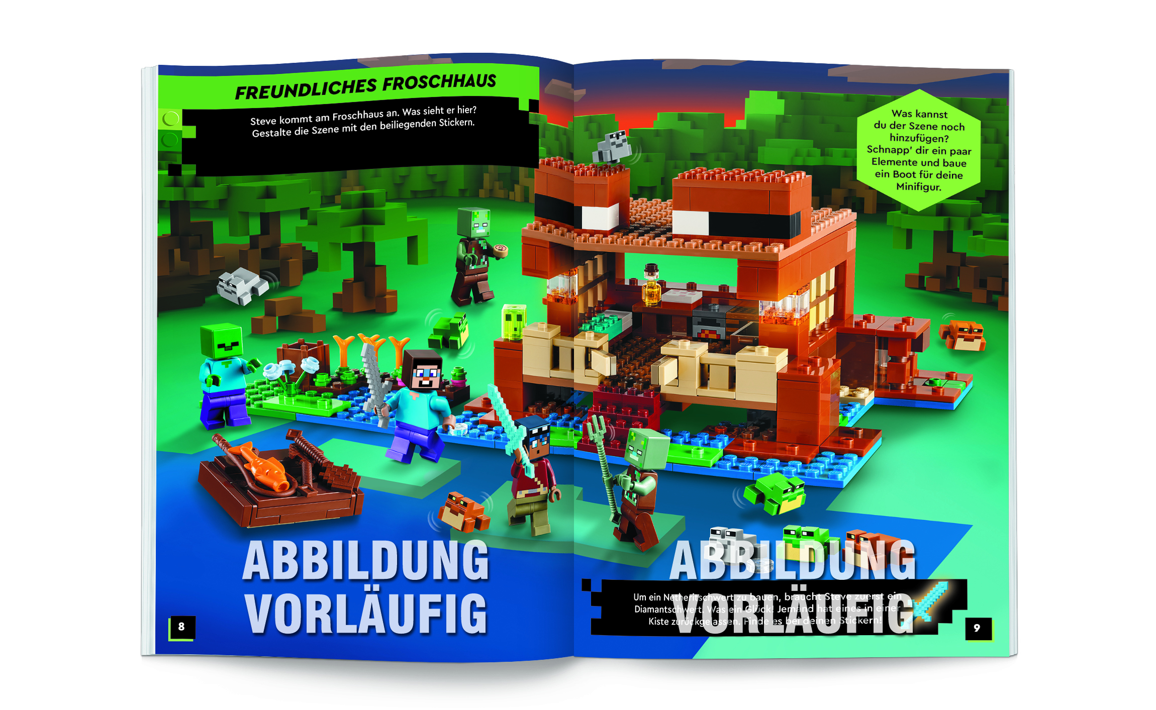 Umfangreiche Bau- und Spielszenen aus den Blockwelten des berühmten Spiels können mit unterschiedlichen Stickern ergänzt und ausgebaut werden.