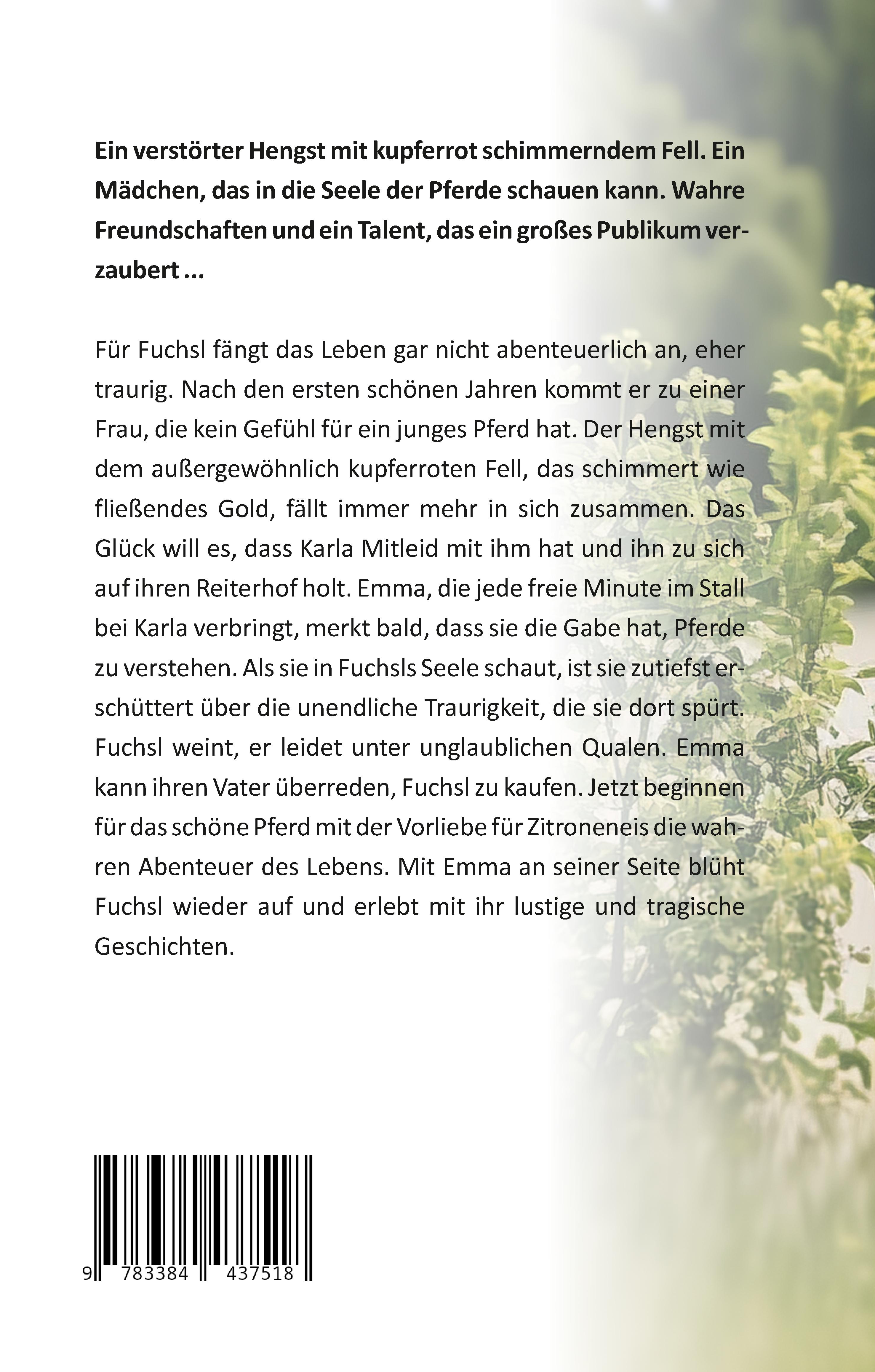 Ein verstörter Hengst mit kupferrot schimmerndem Fell. Ein Mädchen, das in die Seele der Pferde schauen kann. Wahre Freundschaften und ein Talent, das ein großes Publikum verzaubert ... Für Fuchsl fängt das Leben gar nicht abenteuerlich an, eher traurig. Nach den ersten schönen Jahren kommt er zu einer Frau, die kein Gefühl für ein junges Pferd hat. Der Hengst mit dem außergewöhnlich kupferroten Fell, das schimmert wie fließendes Gold, fällt immer mehr in sich zusammen. Das Glück will es, dass Karla Mitleid mit ihm hat und ihn zu sich auf ihren Reiterhof holt. Emma, die jede freie Minute im Stall bei Karla verbringt, merkt bald, dass sie die Gabe hat, Pferde zu verstehen. Als sie in Fuchsls Seele schaut, ist sie zutiefst erschüttert über die unendliche Traurigkeit, die sie dort spürt. Fuchsl weint, er leidet unter unglaublichen Qualen. Emma kann ihren Vater überreden, Fuchsl zu kaufen. Jetzt beginnen für das schöne Pferd mit der Vorliebe für Zitroneneis die wahren Abenteuer des Lebens. Mit Emma an seiner Seite blüht Fuchsl wieder auf und erlebt mit ihr lustige und tragische Geschichten.